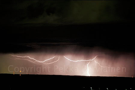 Every so often when hunting for lightnings, the hit is on the very edge of the film. Using a wide angle means that the trace is also very short. This all means that lightning is often only a small streaks of light and have to be enlarged from the very corner of image area. This all results in poor quality pictures which can be seen in many of those in these pages.