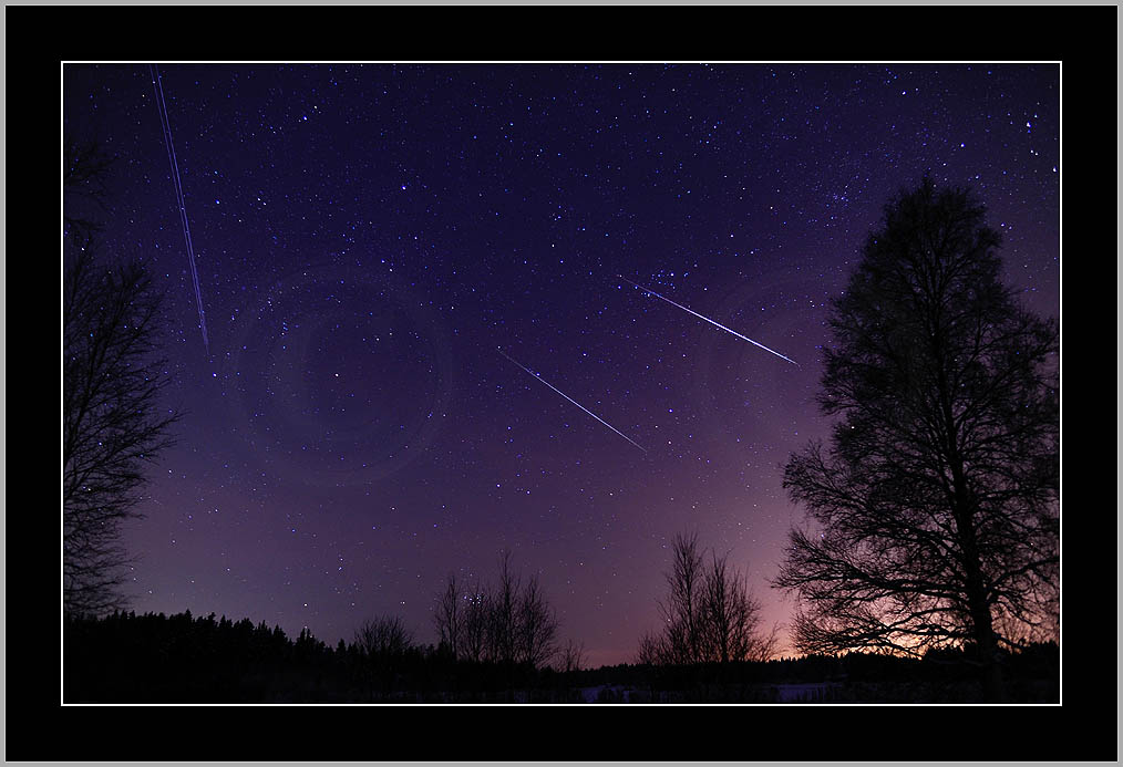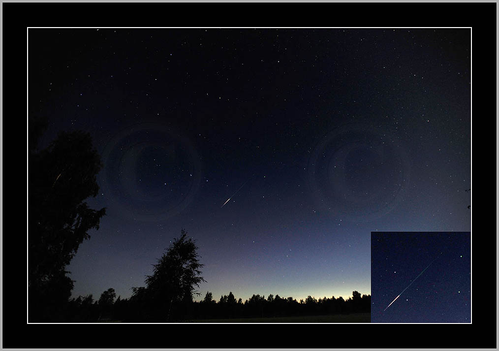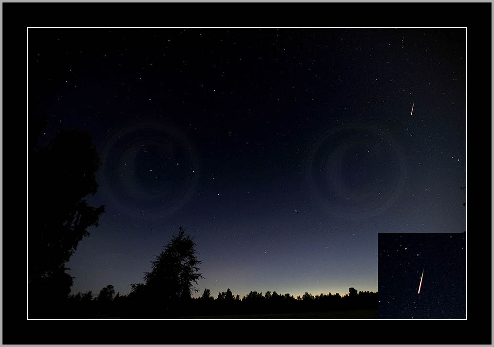 Image like me02342 was for a long time in my wish list: meteor with reflection. It is not an easy crop to catch. You need calm water surface and a very bright meteor low above the water. Our summers are too bright to make any astrophotography and actually the only open window is in late Aug-late Nov; after that waters are frozen 'til late April, and then again it is too light to do astrophotography. Moreover, you need a very fast film meaning short exposures and thus you need to use a lot of film! Only to see bright meteors avoiding your wide angles! But one day you have your moment!