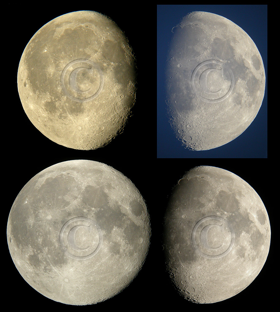You surely notice different colors of lunar images. This is due to several factors. First of all the height of the moon affects on colors. A more pronounced difference is visible when the photography has been done in bright twillight; this gives a bluish tint to picture and especially it is visible as a darkblue-cyan tint on the terminator. Also air temperature affects: deep in subzero CCD-chip casts a magenta tint. Finally, when adjusting lightness and contrast color saturation will be affected considerably. In these pages colors have not been tuned to something "normal"; only the most disturbing effects have been corrected.