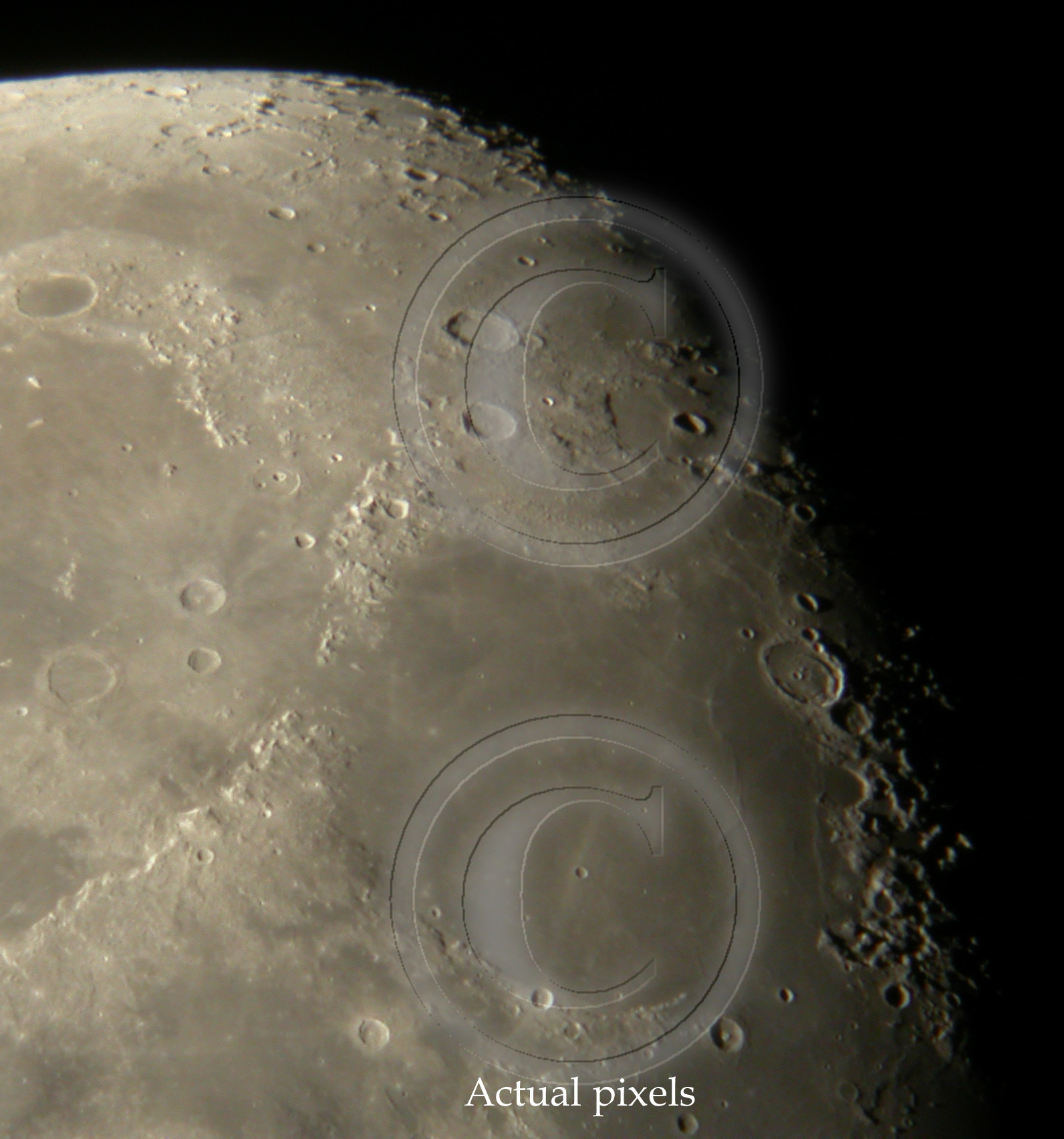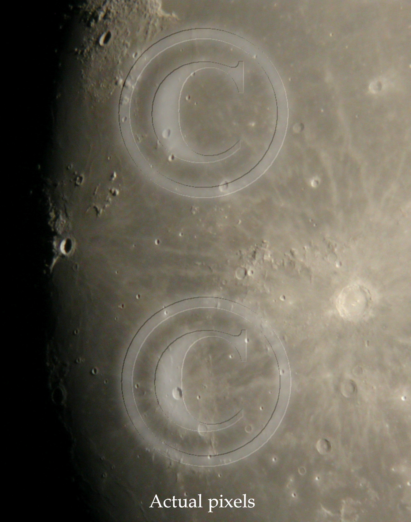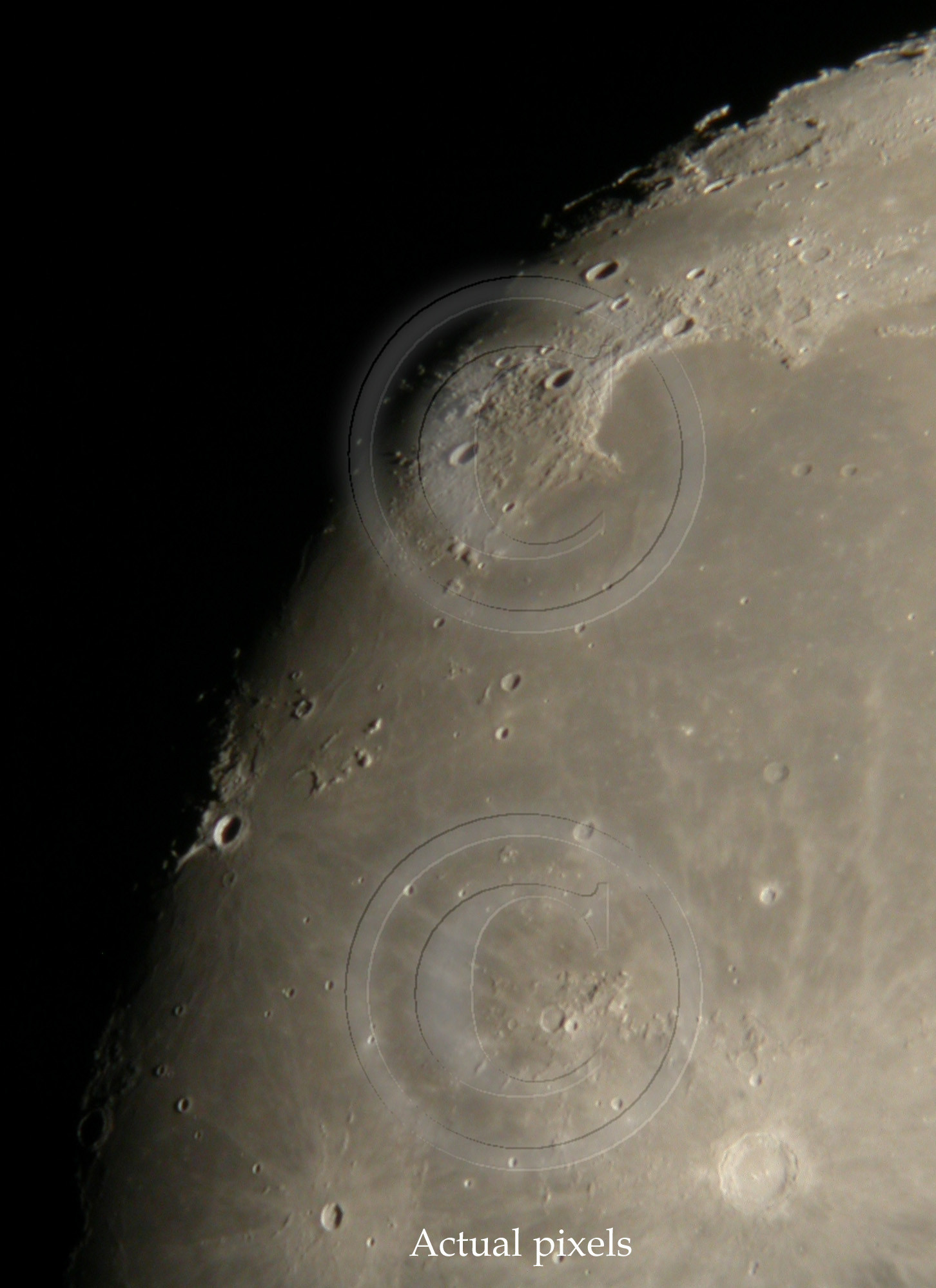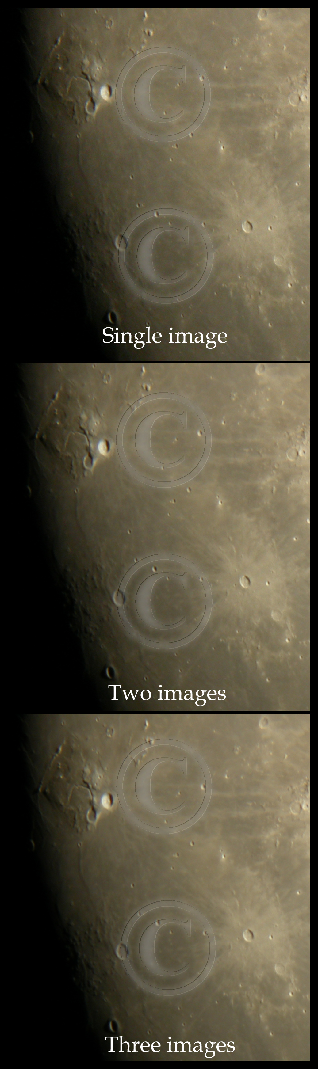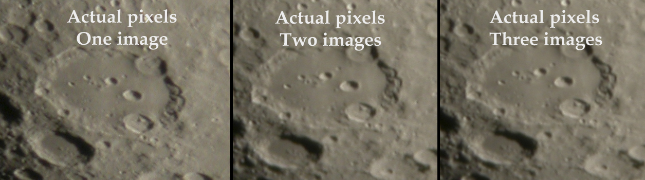 Due to these averaged images, there seems to be dublicate views of lunar surface. In general there is not much to gain in using 3 or more images to averaging compared to what is achieved by 2 image averaging. See samples below. Both images show actual pixels.