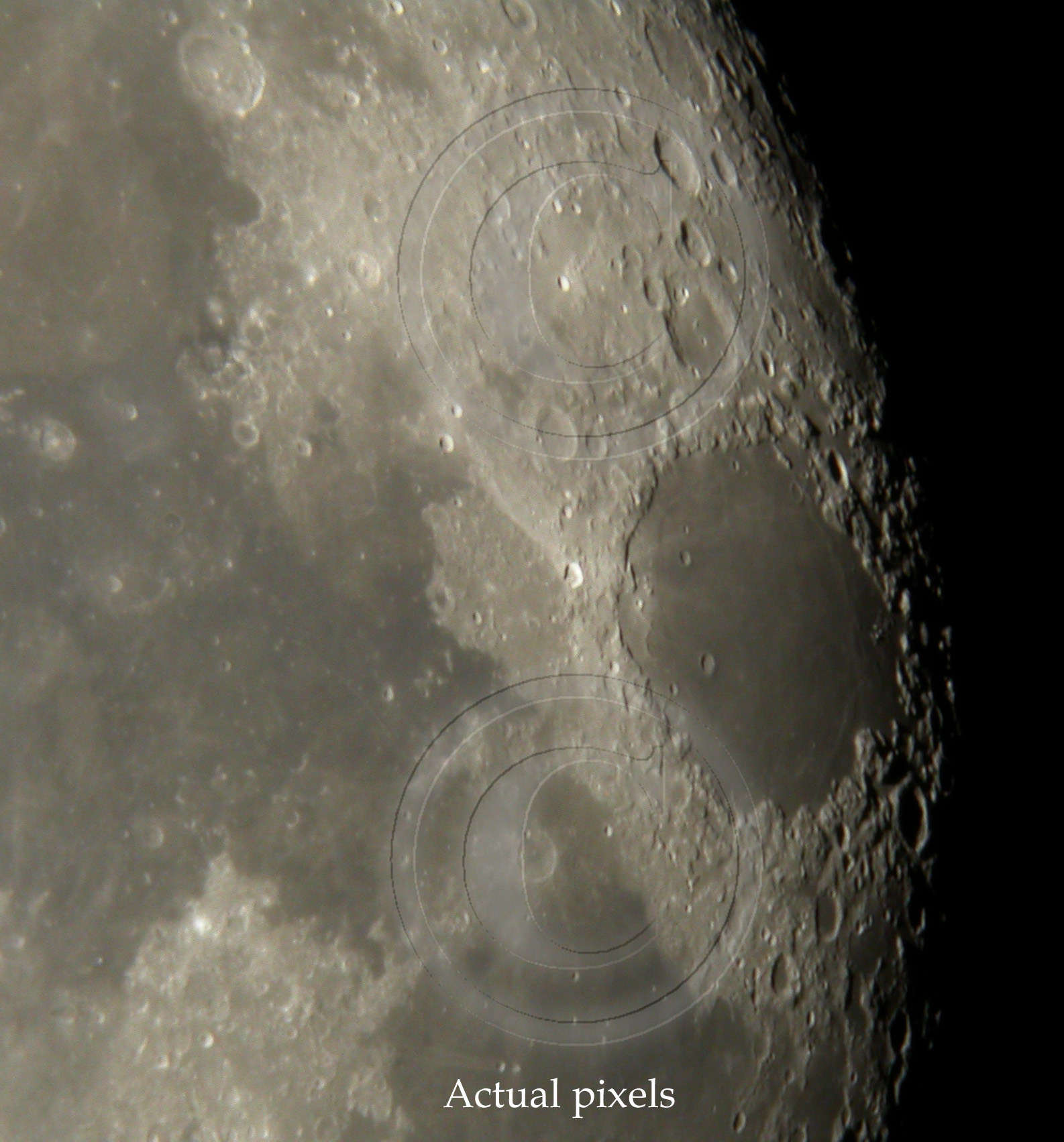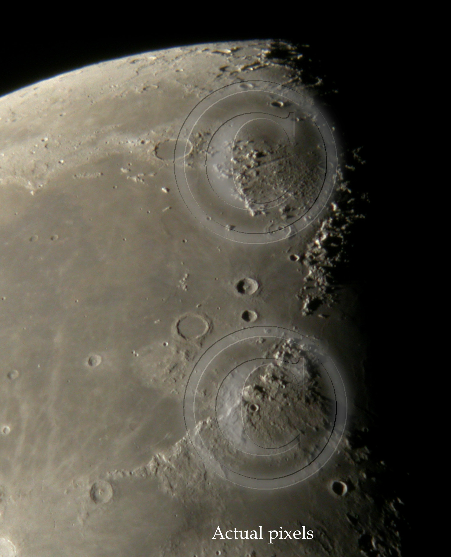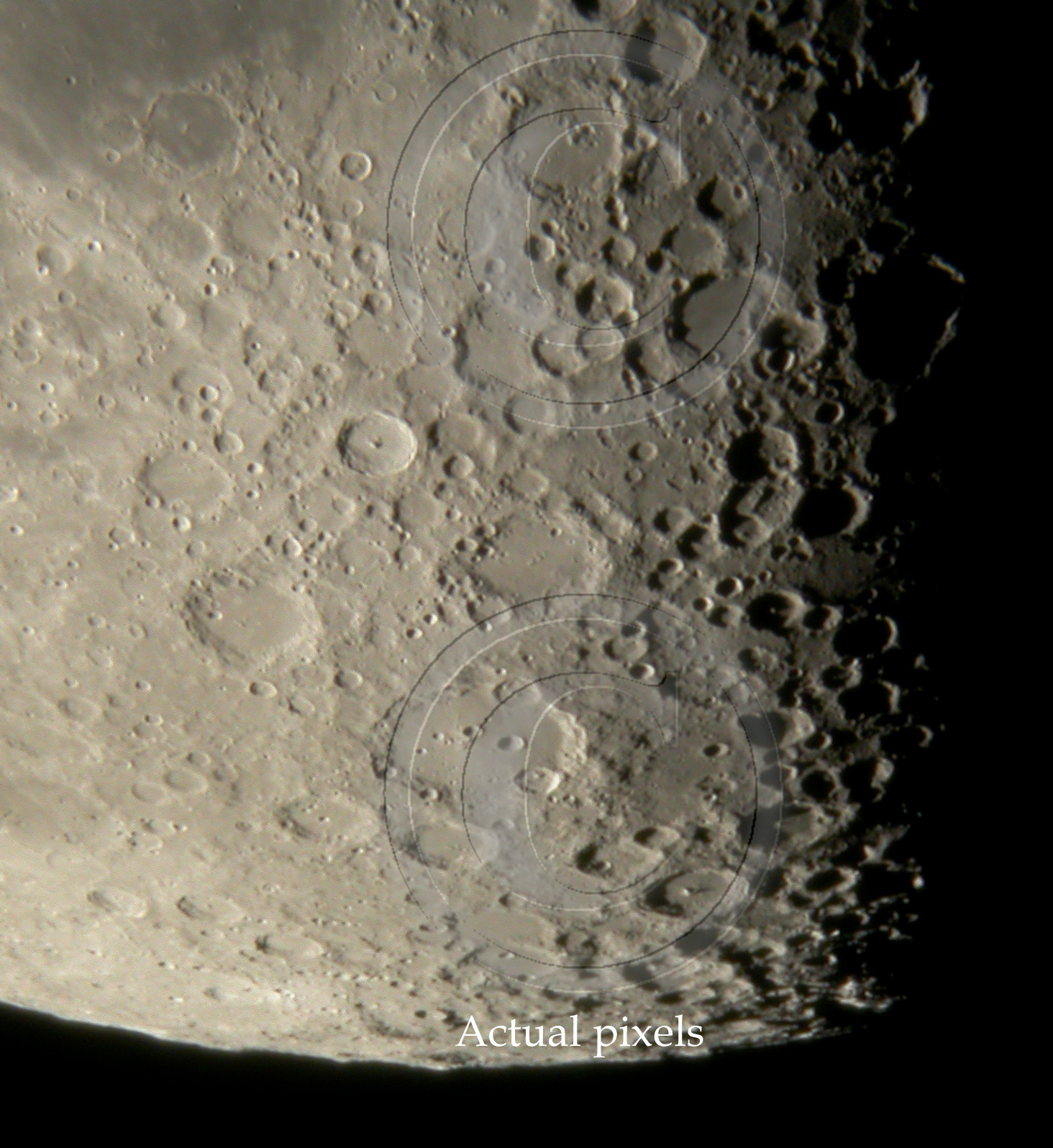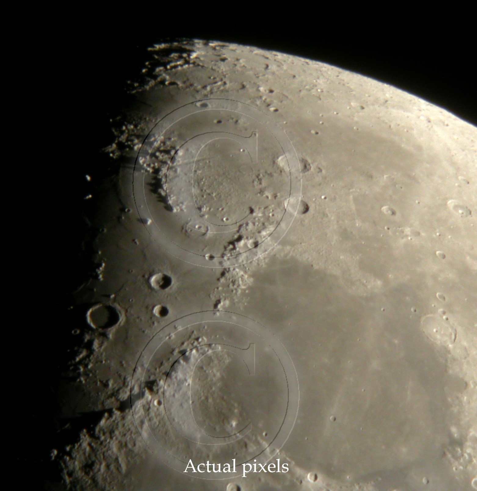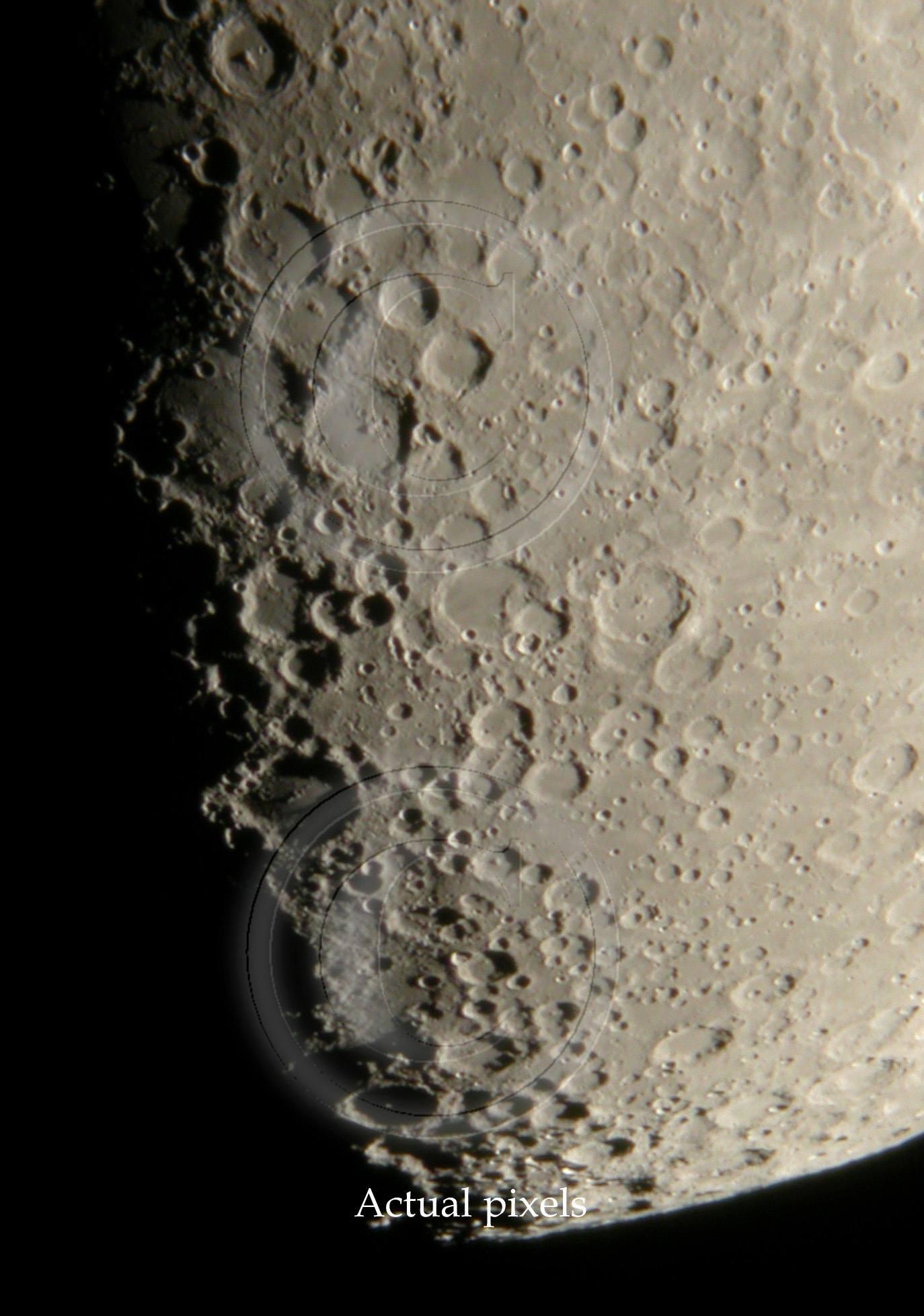 Due to these averaged images, there seems to be dublicate views of lunar surface. In general there is not much to gain in using 3 or more images to averaging compared to what is achieved by 2 image averaging. See samples below. Both images show actual pixels.