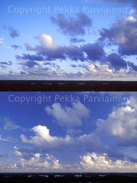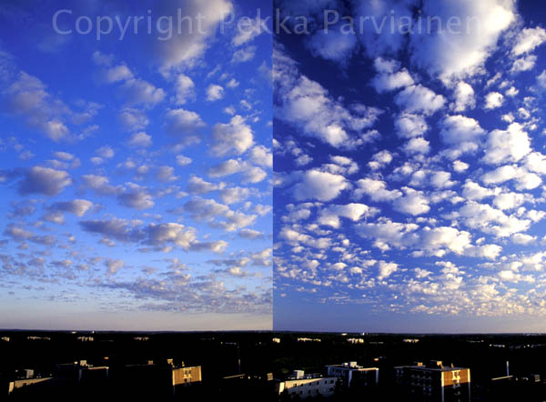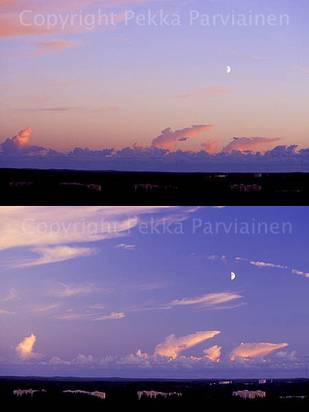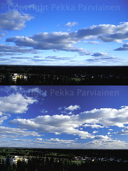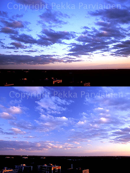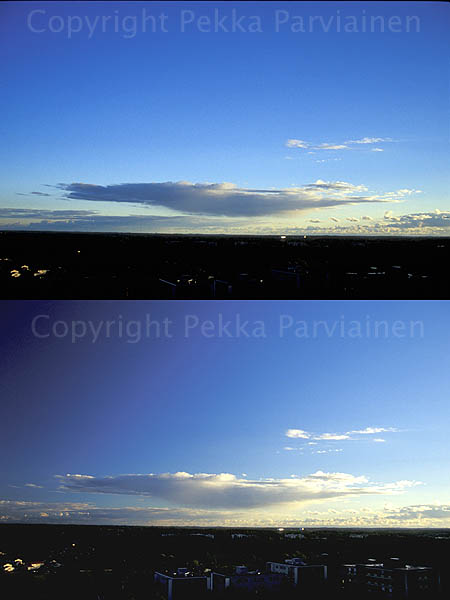Several different phenomena like Earth’s shaddow on atmoshere, crepscular and anti-crepscular rays, polarization of the sky and twillight phenomena. (Miscellaneous optical phenomena seen in the sky.) Polarization pairs show same scene both without pol-filter (upper or left image) and with pol-filter with max effect.
