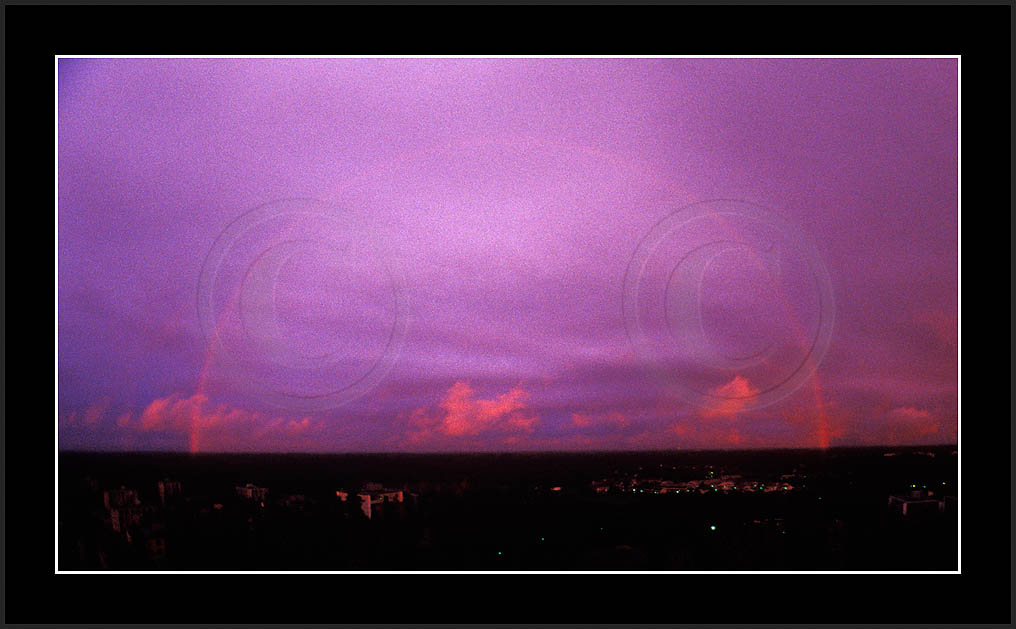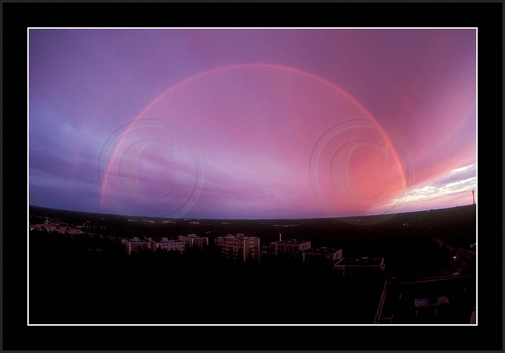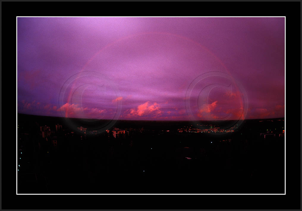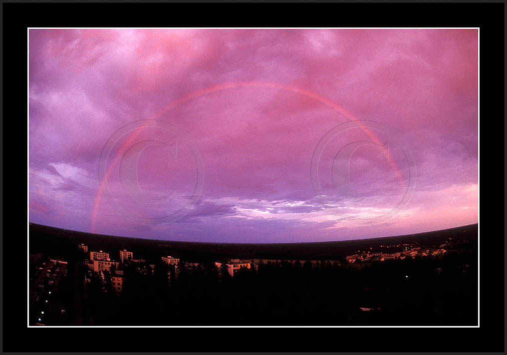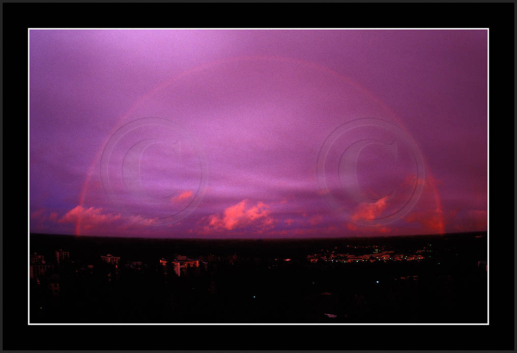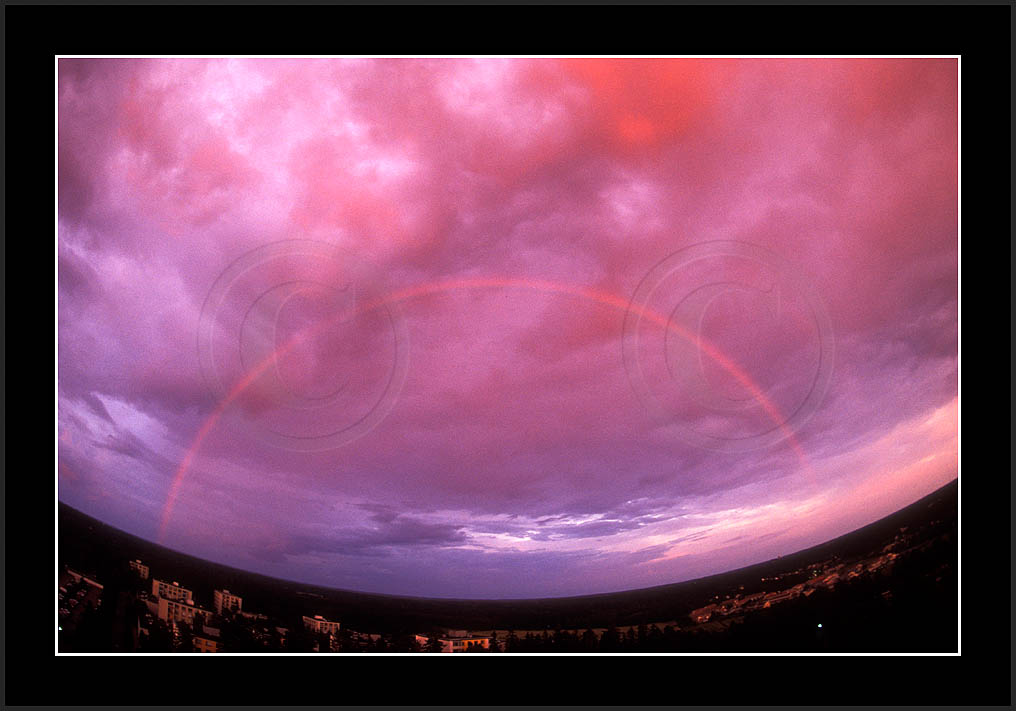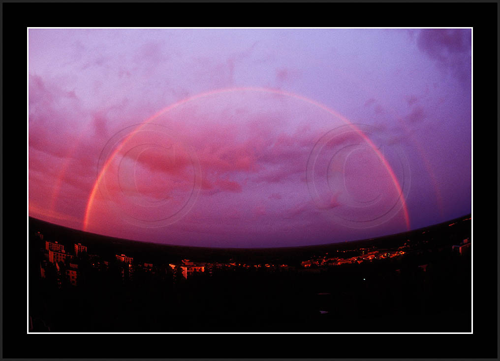 Red rainbow is born, when the sun is in the horizon and is about to descend. Red light hits the rain in the opposite horizon creating reb bow. Picture psk1534 shows the sun while in the opposite horizon the red bow 1532 could be seen.