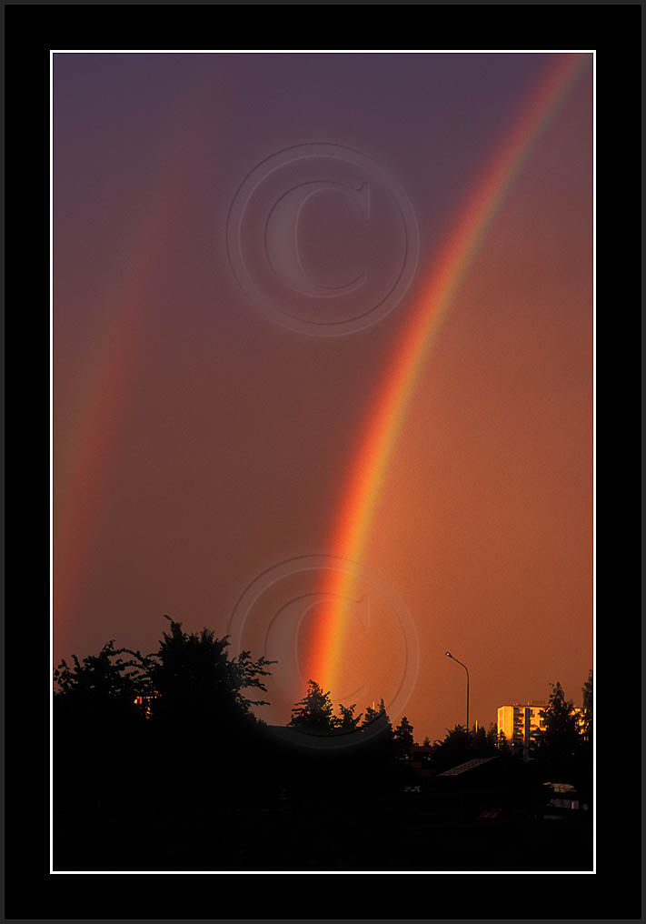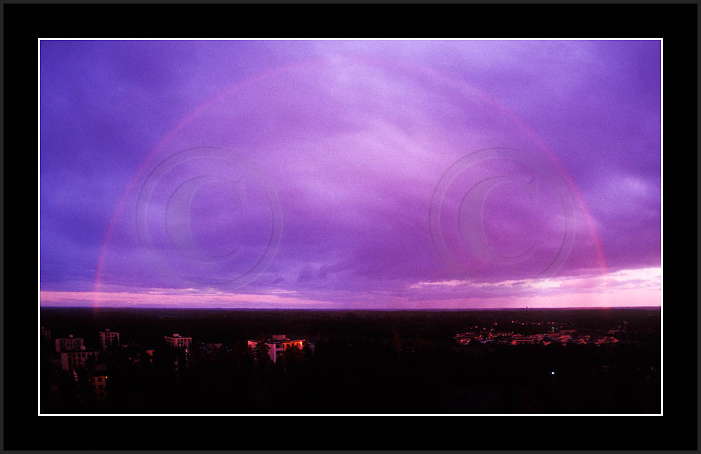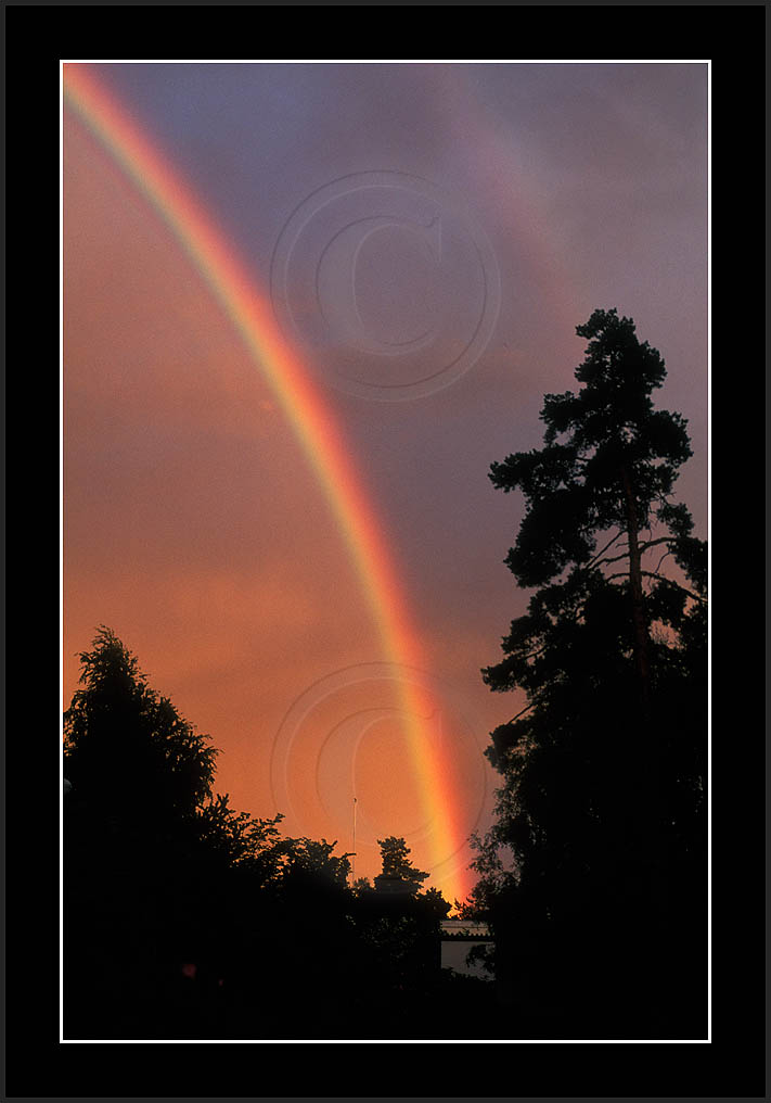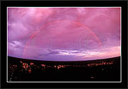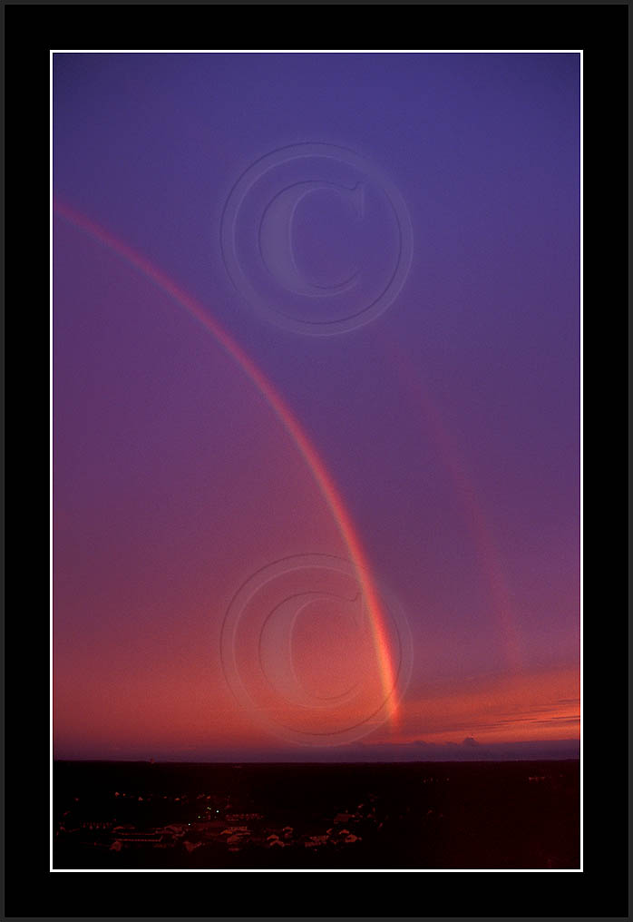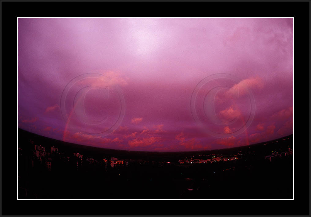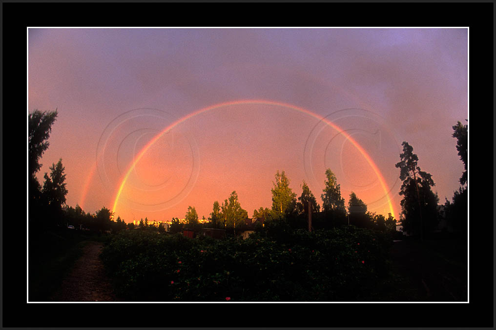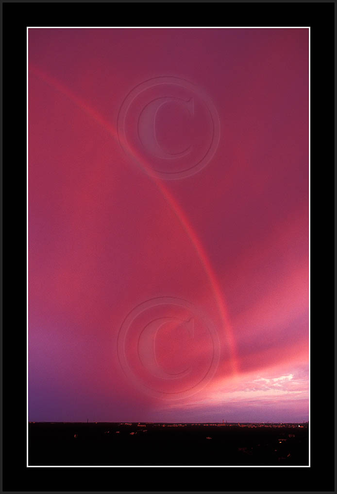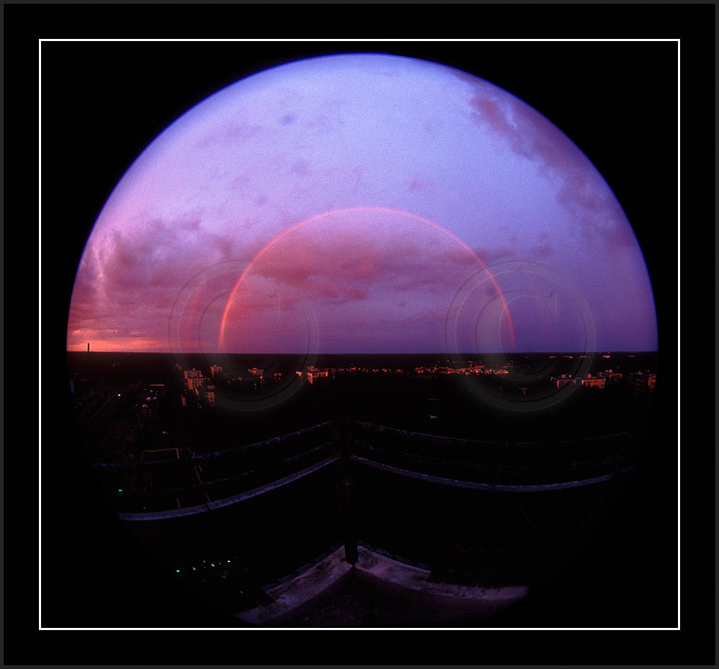 Red rainbow is born, when the sun is in the horizon and is about to descend. Red light hits the rain in the opposite horizon creating reb bow. Picture psk1534 shows the sun while in the opposite horizon the red bow 1532 could be seen.