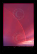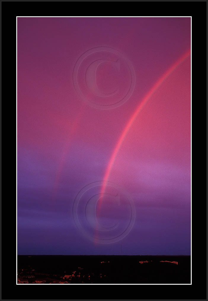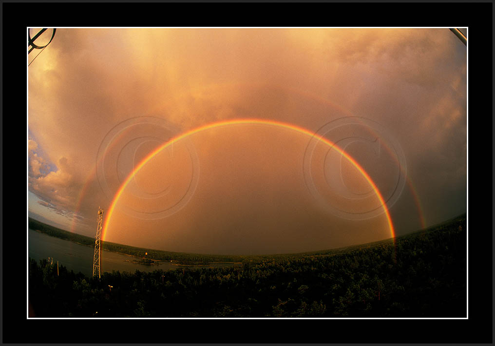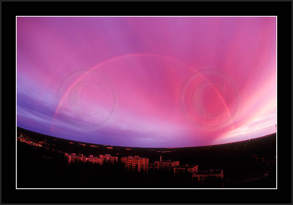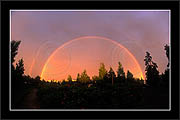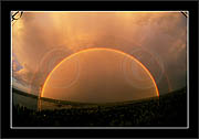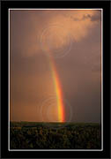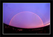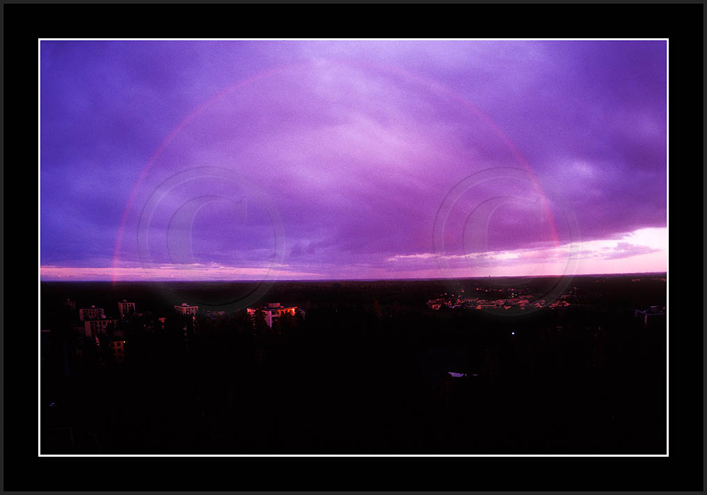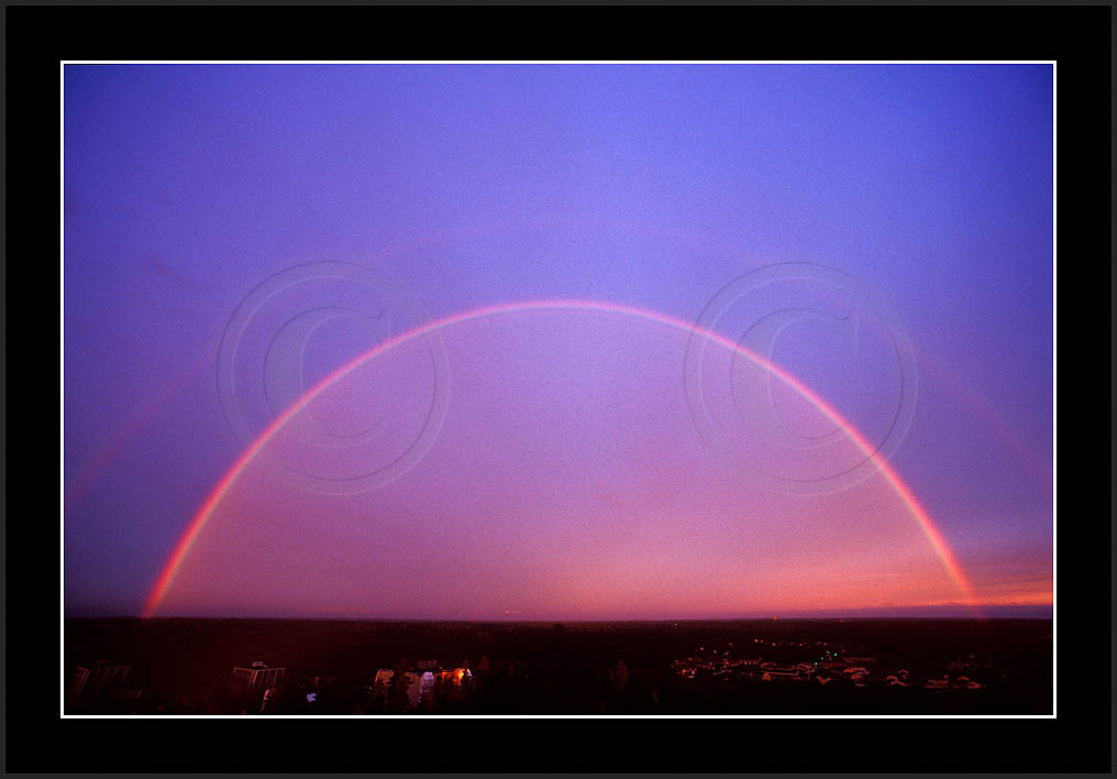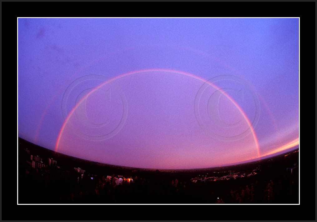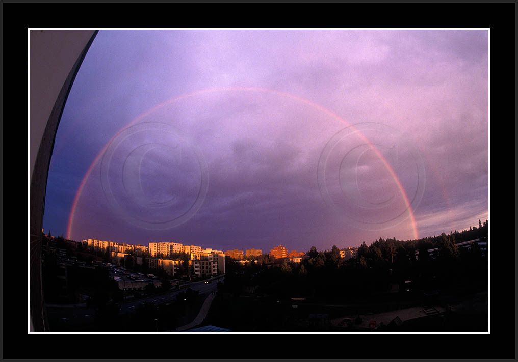 Red rainbow is born, when the sun is in the horizon and is about to descend. Red light hits the rain in the opposite horizon creating reb bow. Picture psk1534 shows the sun while in the opposite horizon the red bow 1532 could be seen.