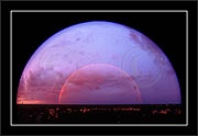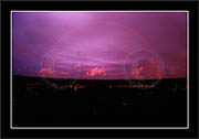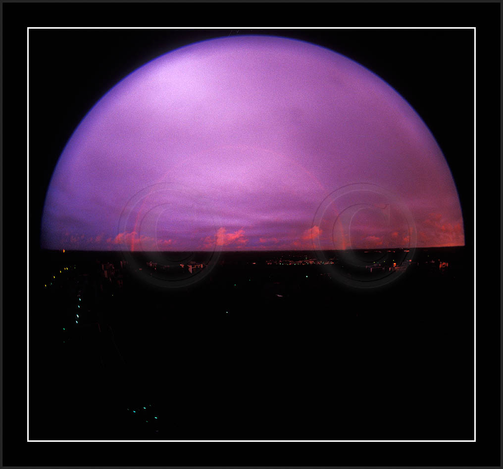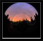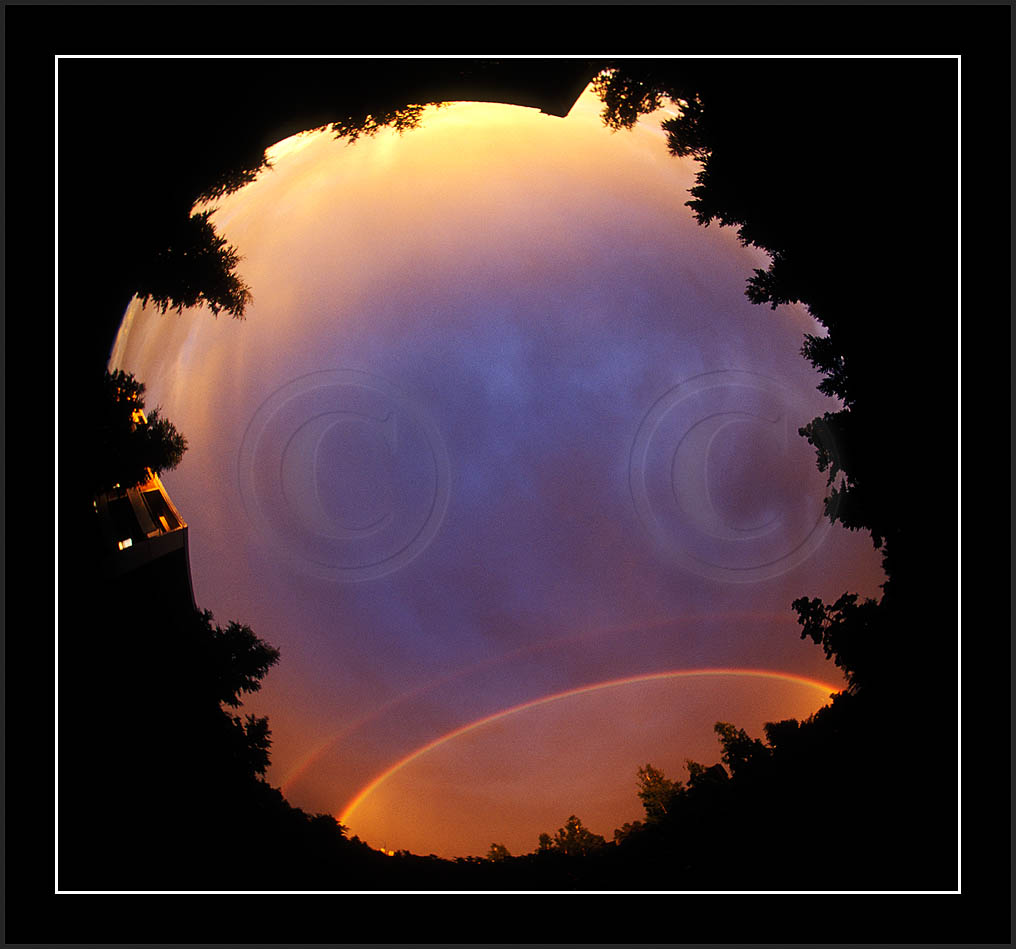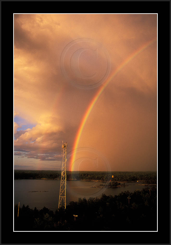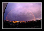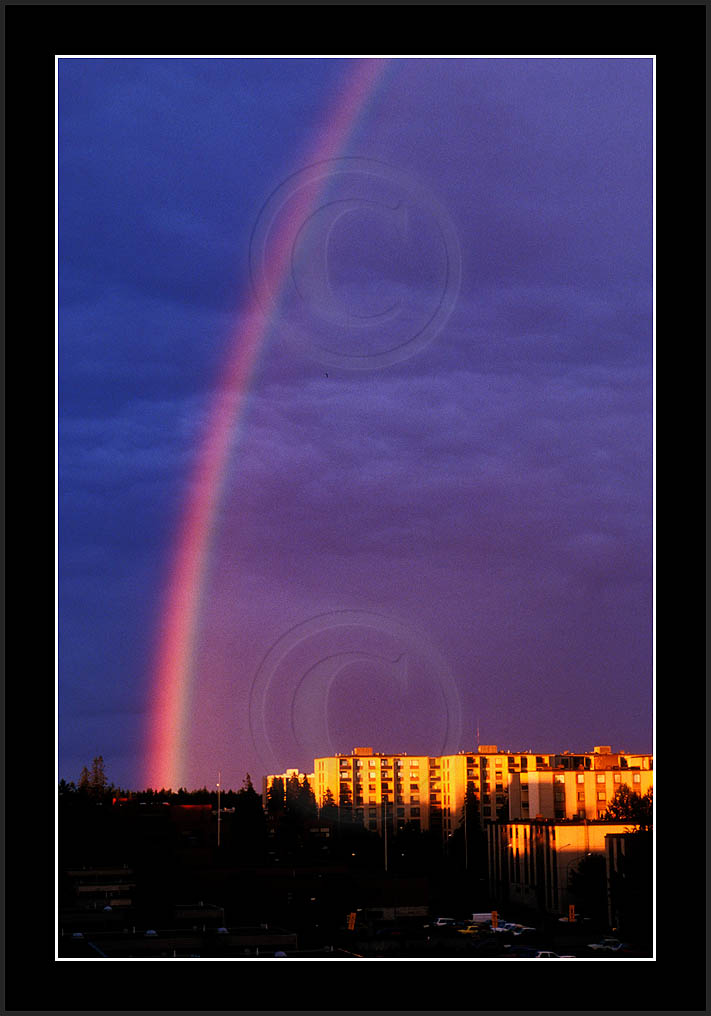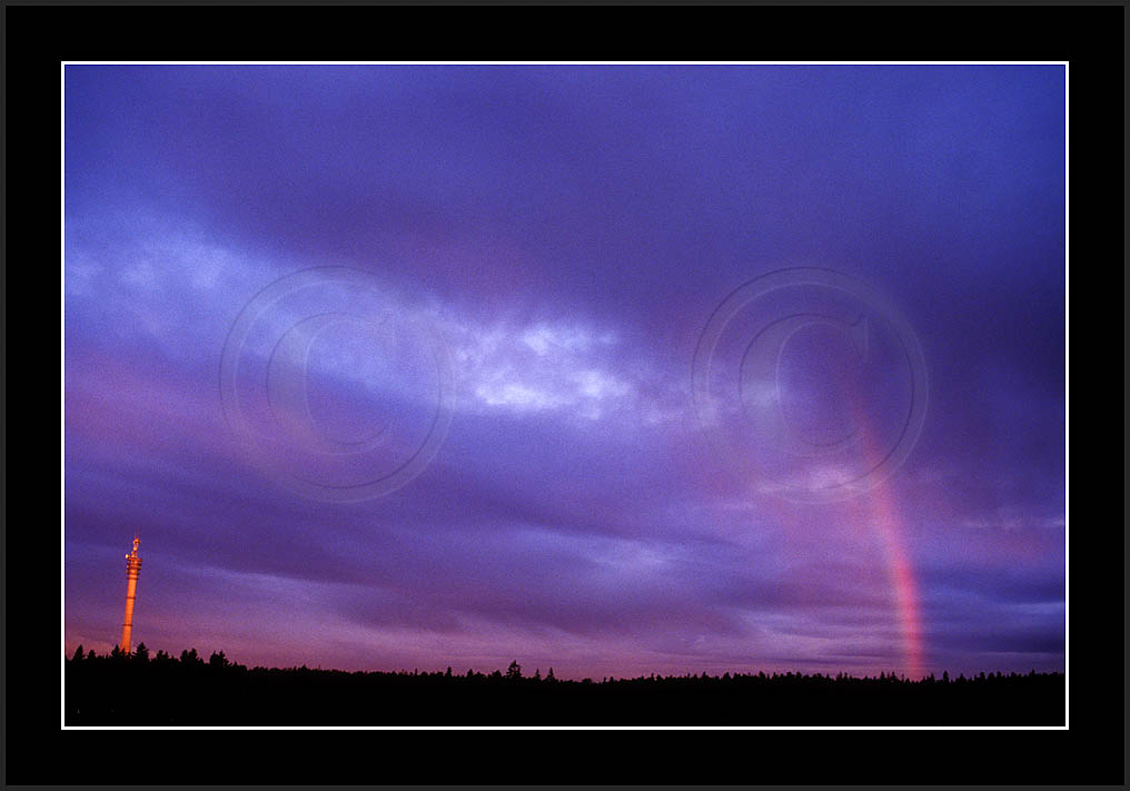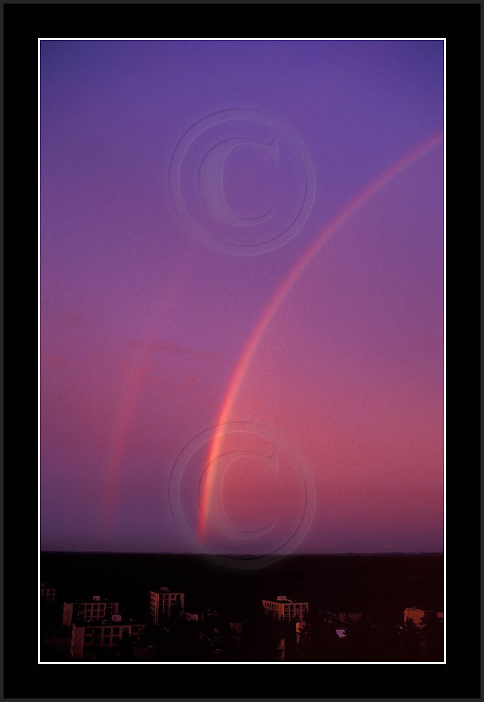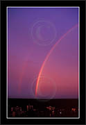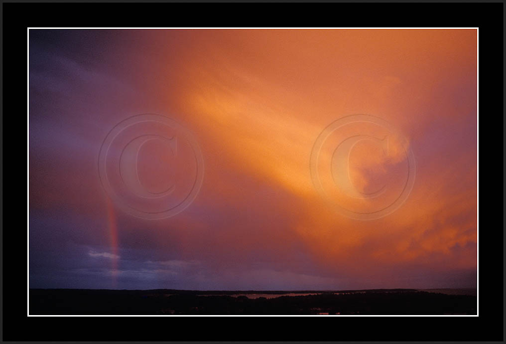 Red rainbow is born, when the sun is in the horizon and is about to descend. Red light hits the rain in the opposite horizon creating reb bow. Picture psk1534 shows the sun while in the opposite horizon the red bow 1532 could be seen.
