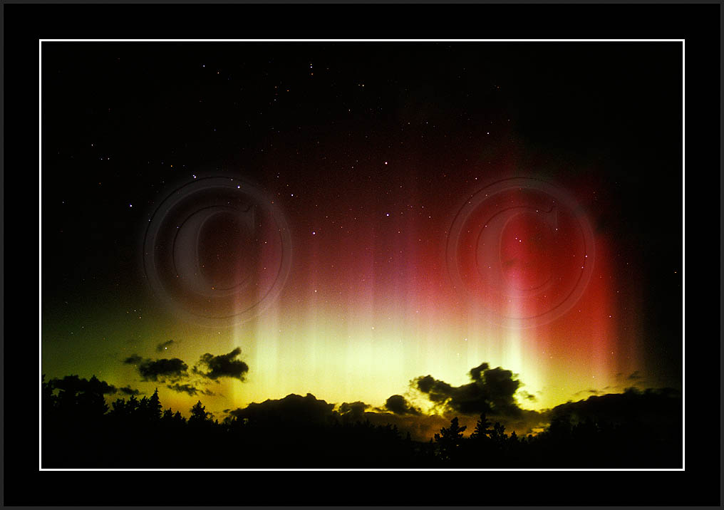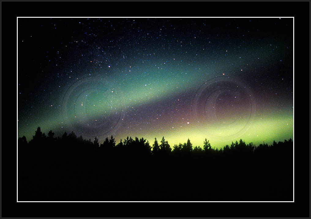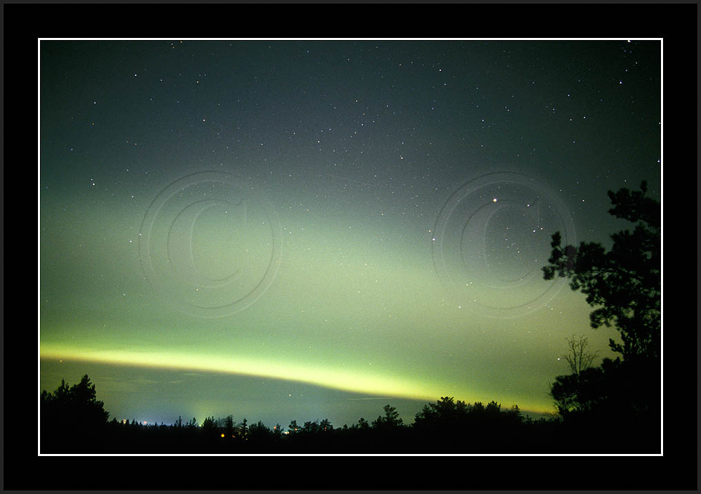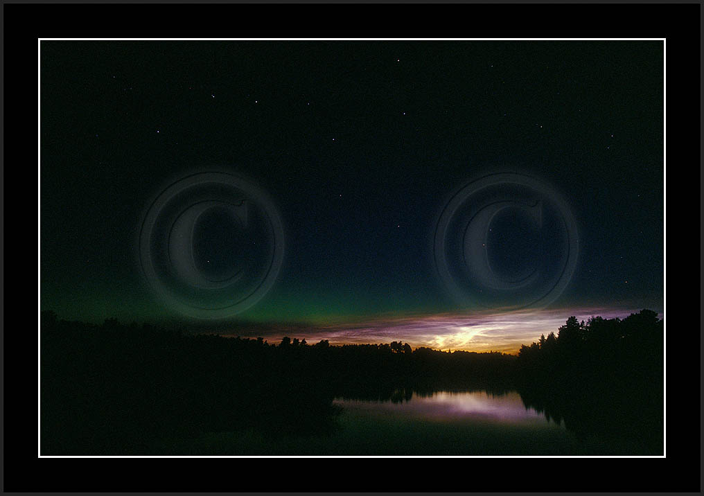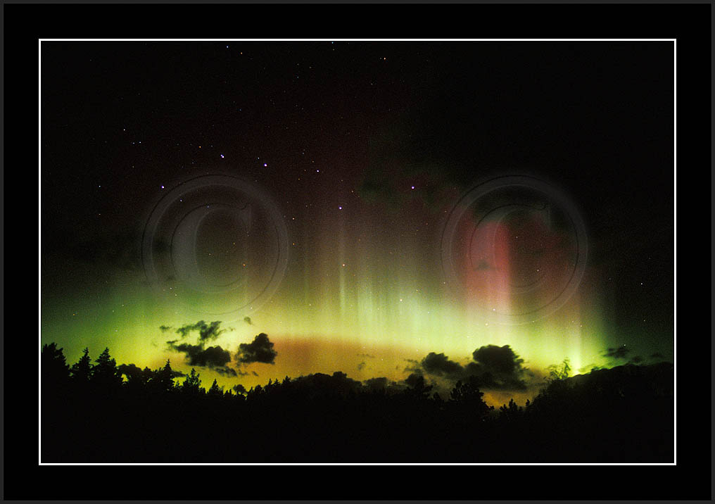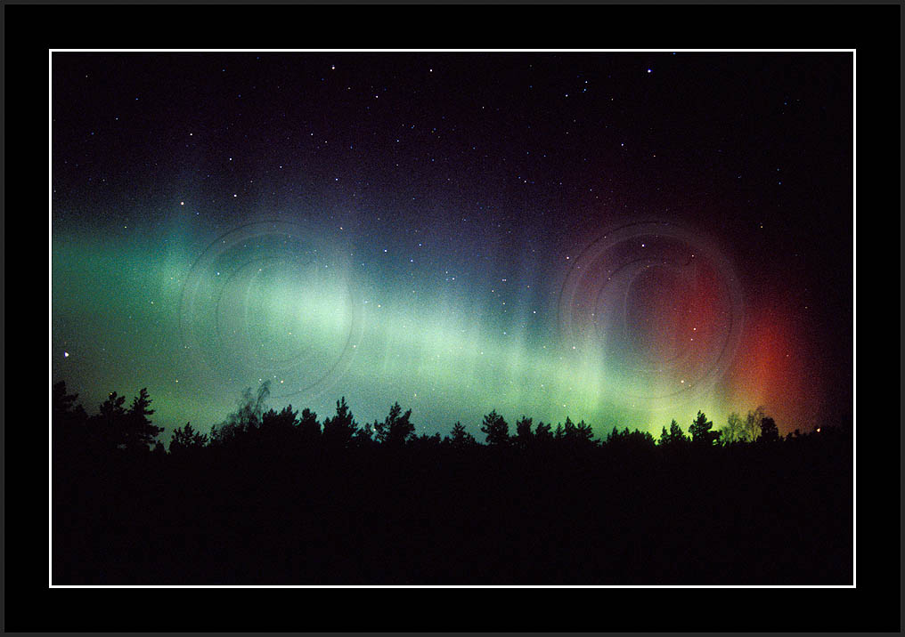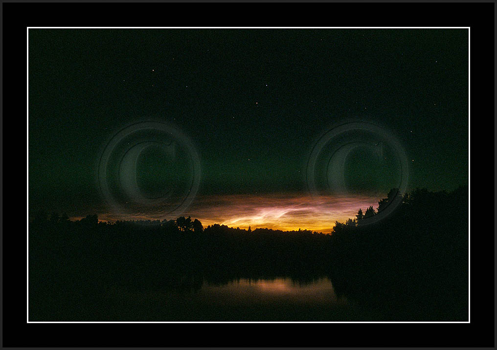 During these years auroral activity was pretty low at my (geomagnetic) latitude. Images re05442-re05553 show how Kodak's new film E100SW made aurora photography very rewarding: one film could catch the whole spectrum of colours. Also Kodak's old and cheaper Elitechrome EB100 gives similair results (both films exposed and developed for 400ASA speed). A bit more is said about films, digital cameras and visual perception on aurora page "Year 2001". Image re06212 is my best recording of simultaneous aurora and noctilucent cloud (NLC). However, showing both phenomena in same scan is hard due to their large difference in brightness. NLC is overexposed between horizon and aurora.