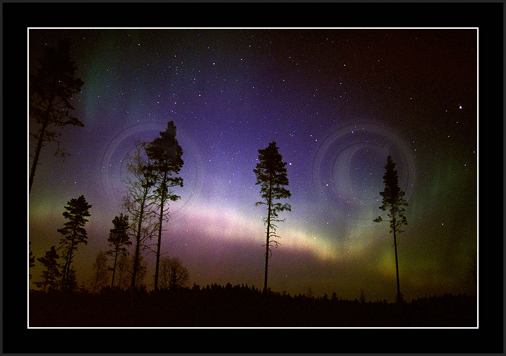 Autumn 2002 turned out to be a good period for auroras. Already in light late summer sky Aug 9/10 during Perseid watch a lonely arch did show up (re21534), followed by a short lived but nice display Sep 3/4 (re21631-re21732). Sep continued with increased activity in 7/8, but unfortunately I had a most severe fog much of the night and could not get too good a history of that night (re21832 and re 21953). Then, finally after having got the first truly dark skies, in Sep 10/11 a good display was witnessed (re22124-re23332) followed by another less spectacular on in Sep 11/12 (images re23433...). For Oct 2002 see two next pages.