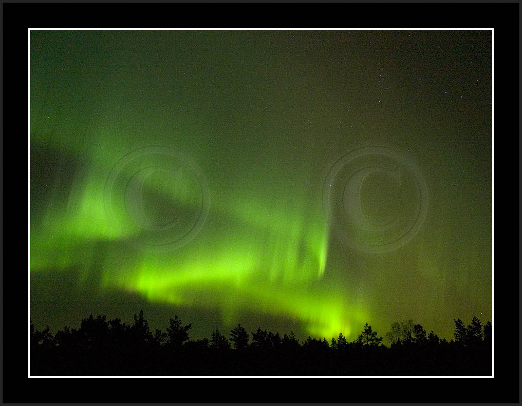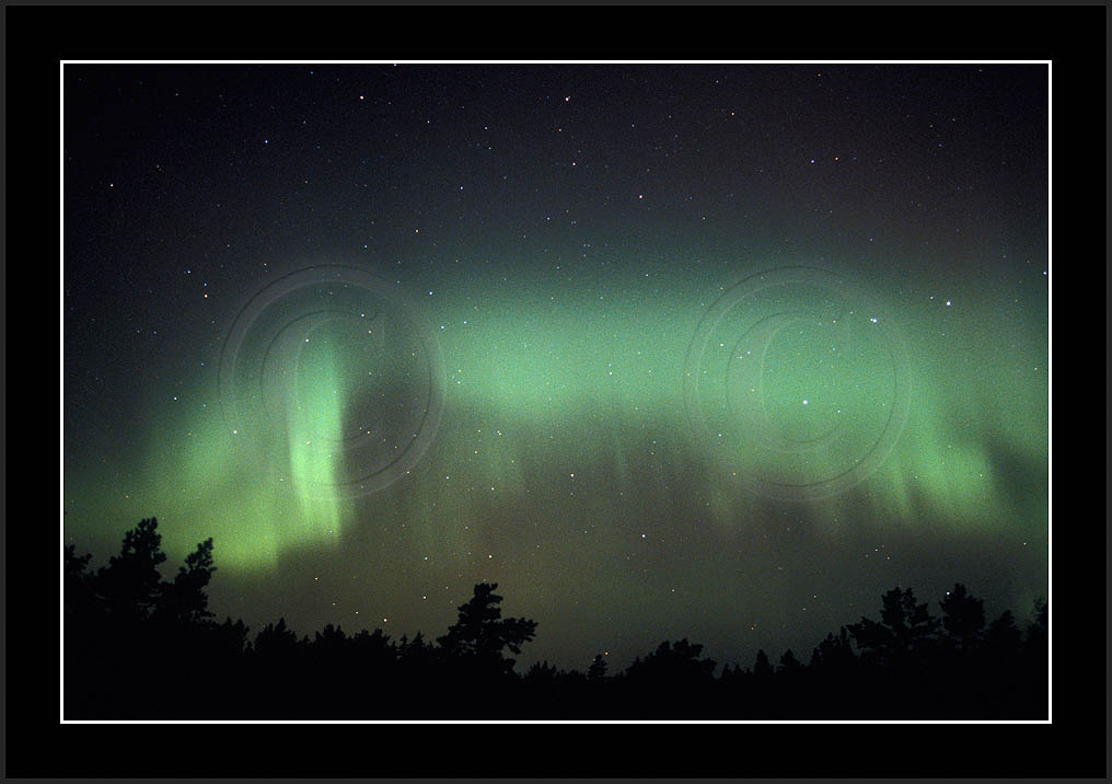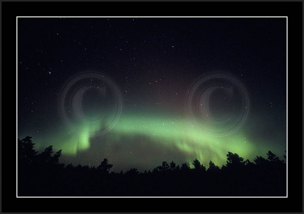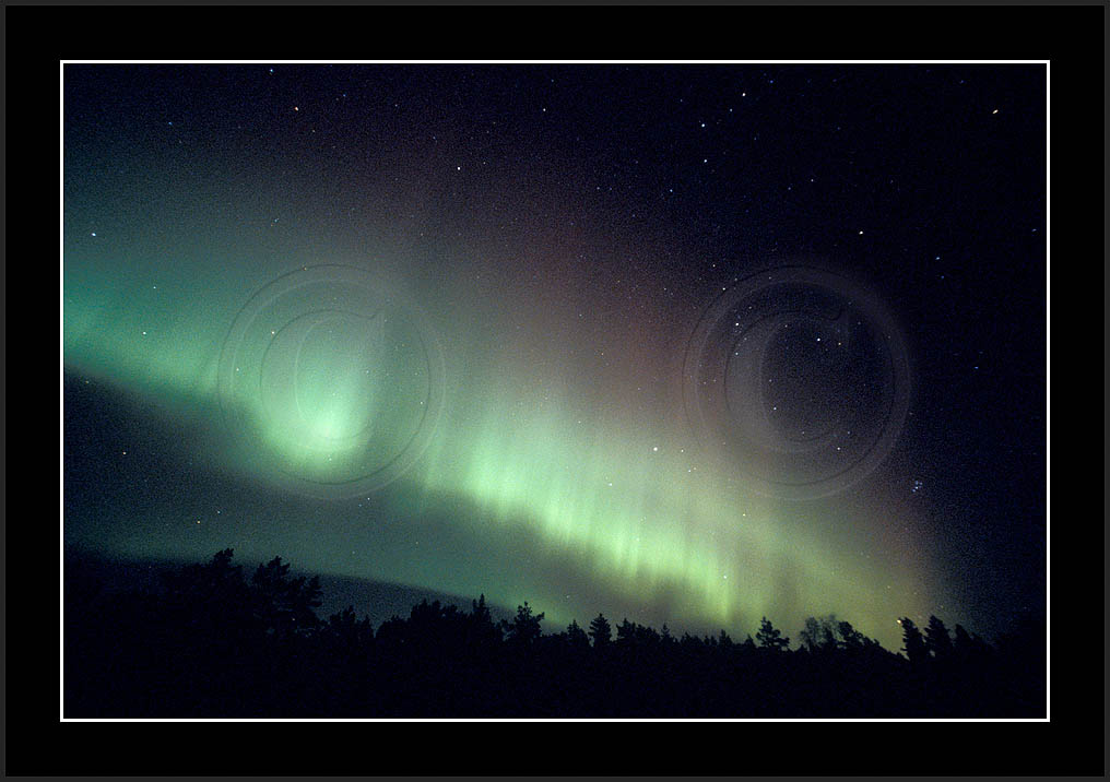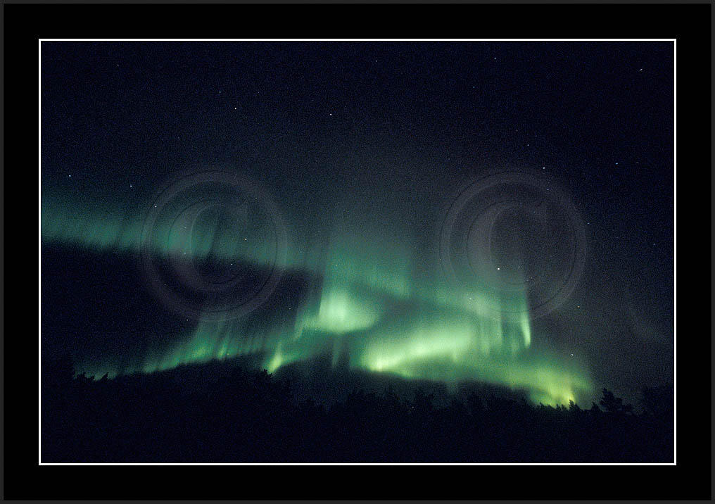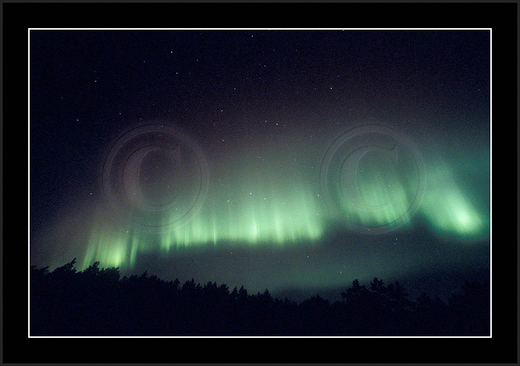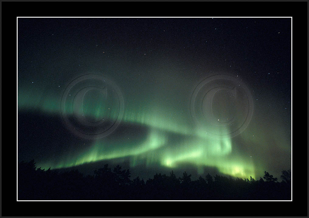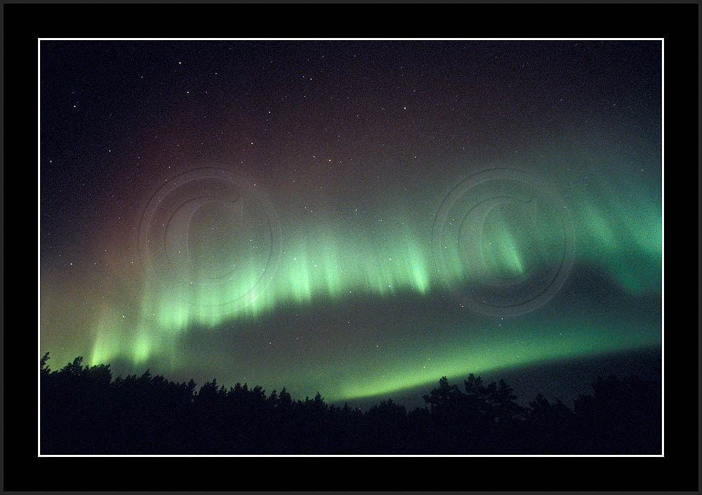 After October's first major storm one cloudy (and also "aurora free") night was followed by another major display on 3/4 (all images here down to re29744). Missing colours (but green) was quite evident during the night; also there was not too much fine structure in the vast aurora forms. Again after a couple of cloudy (and again practically "aurora-free") nights one more night Oct 7/8 (images re29821-30813) was lit by heavenly lights. This night, however, was partly spoiled by clouds. Apparently I lost the very high point of the display although the final bright red column was very conspicious.