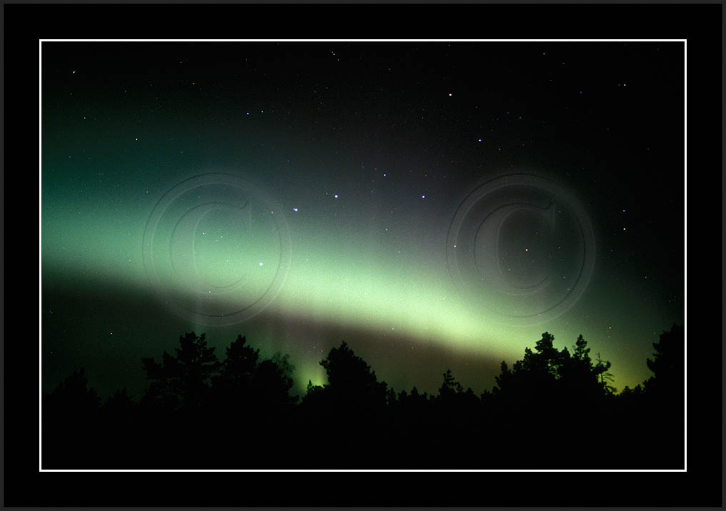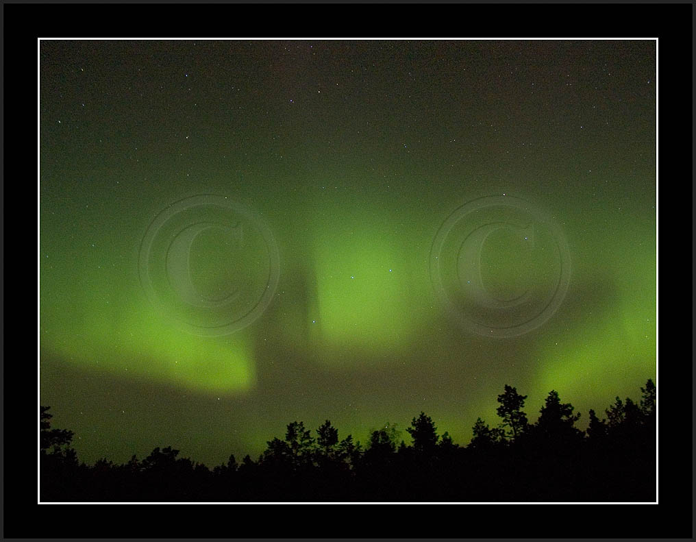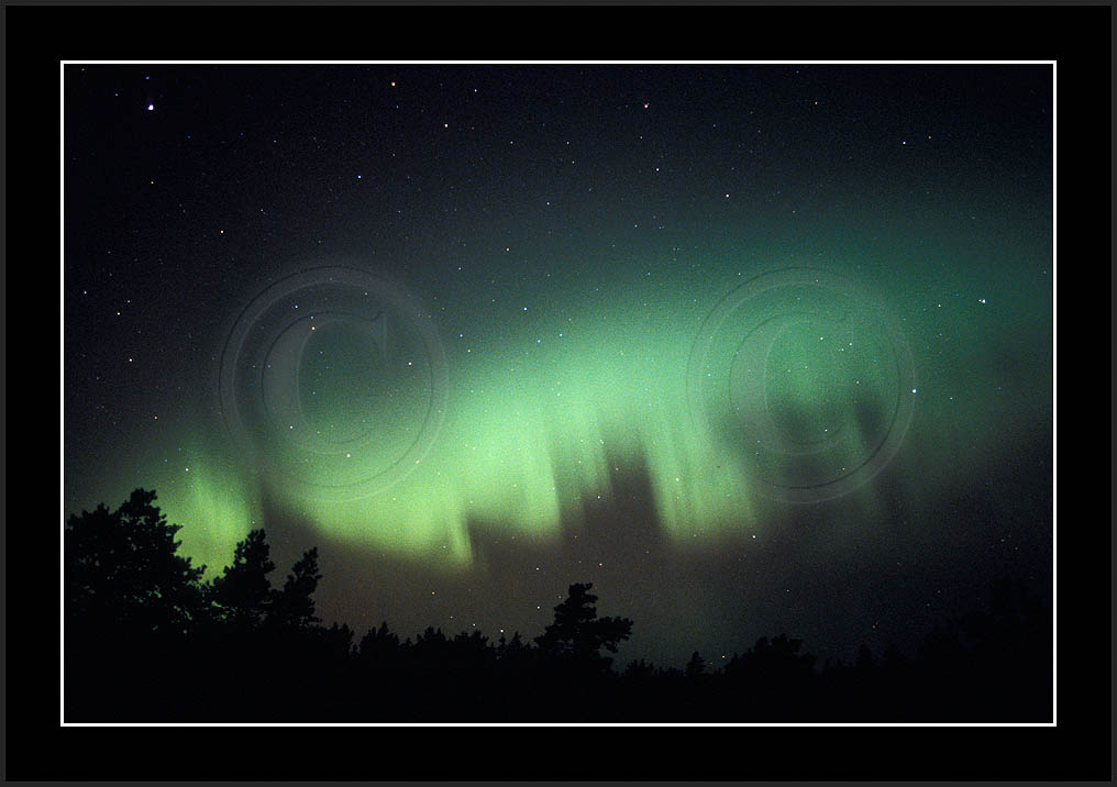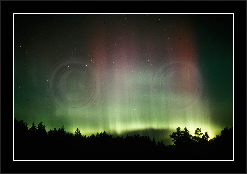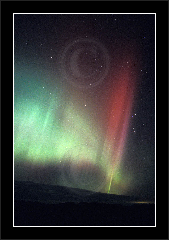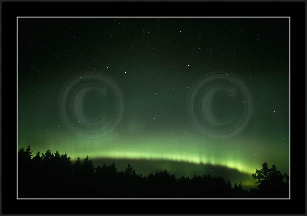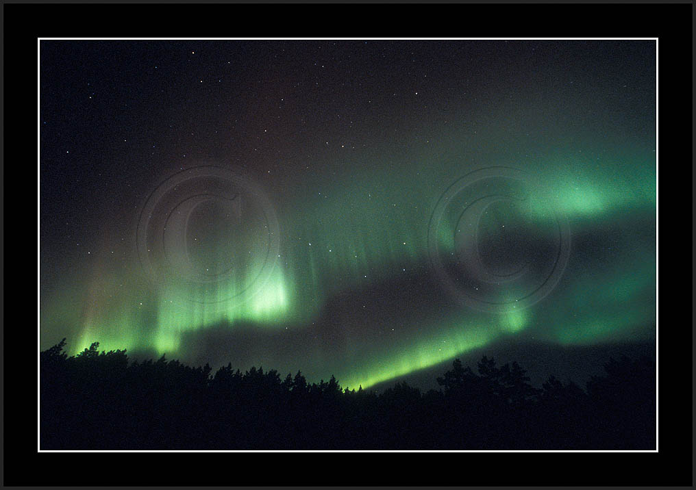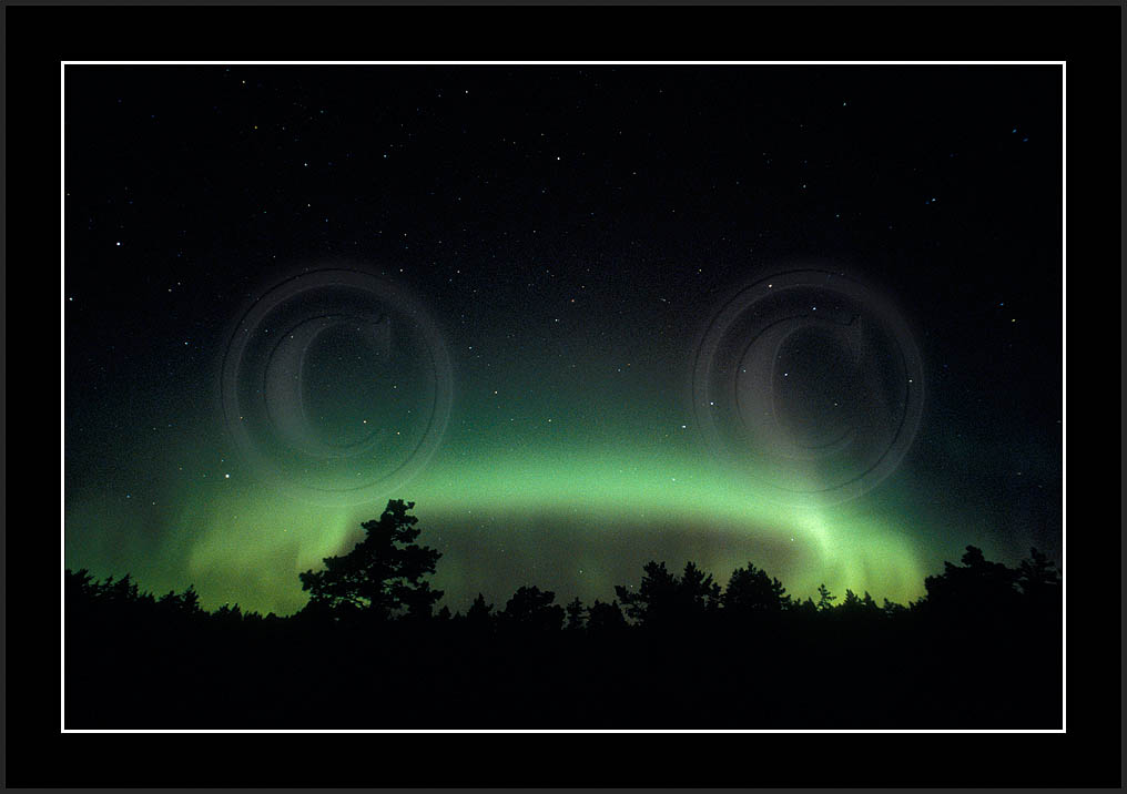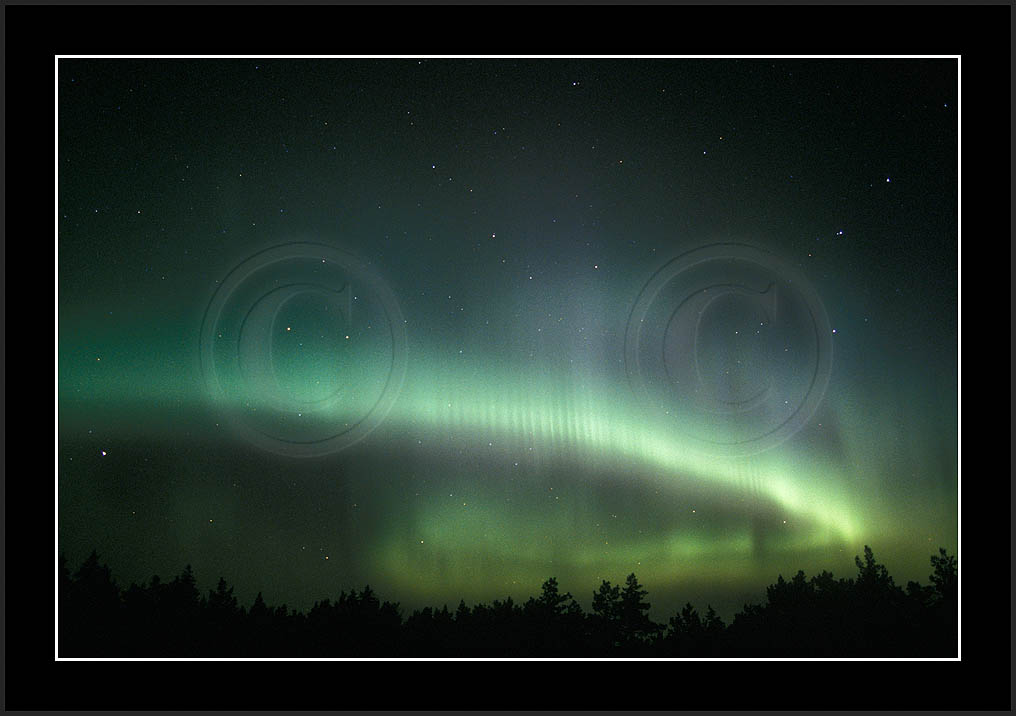 After October's first major storm one cloudy (and also "aurora free") night was followed by another major display on 3/4 (all images here down to re29744). Missing colours (but green) was quite evident during the night; also there was not too much fine structure in the vast aurora forms. Again after a couple of cloudy (and again practically "aurora-free") nights one more night Oct 7/8 (images re29821-30813) was lit by heavenly lights. This night, however, was partly spoiled by clouds. Apparently I lost the very high point of the display although the final bright red column was very conspicious.
