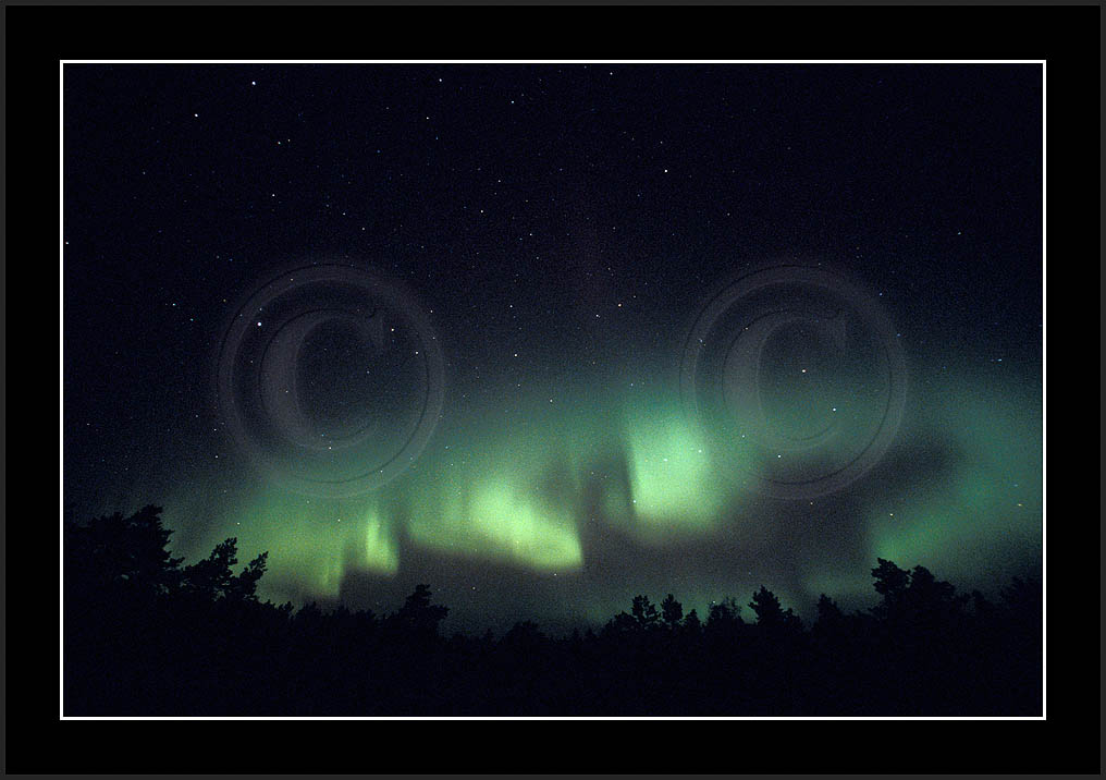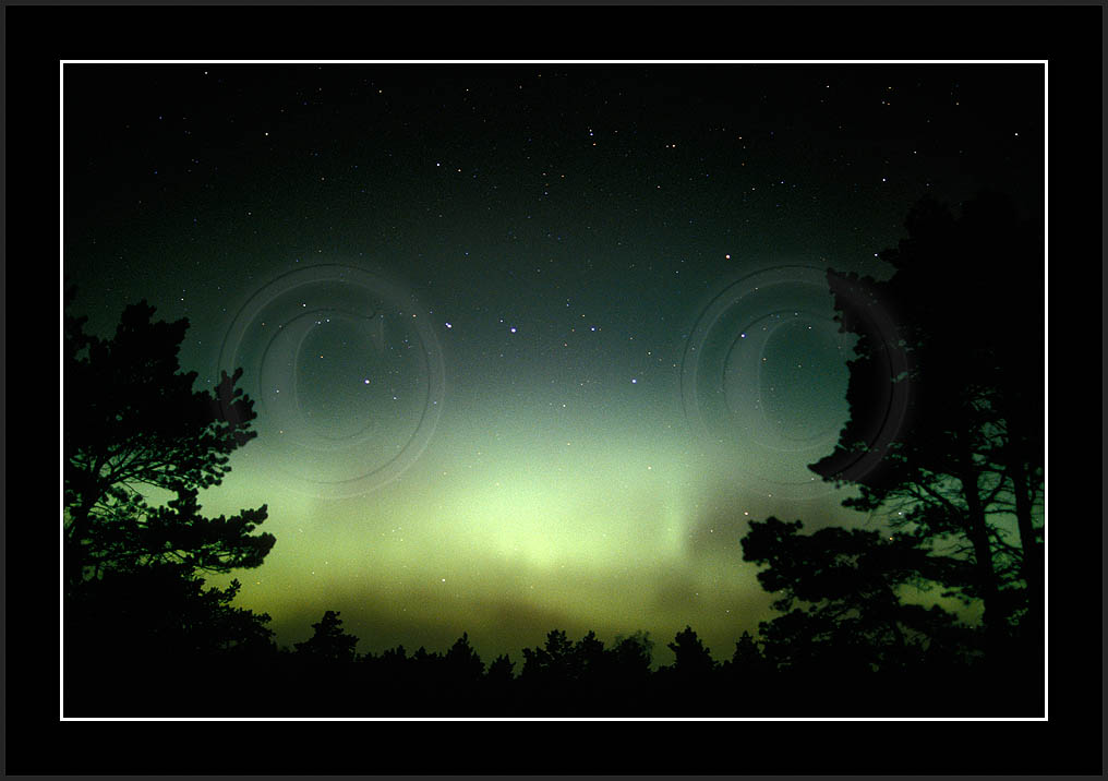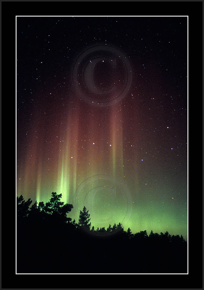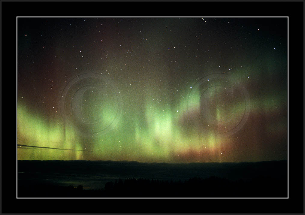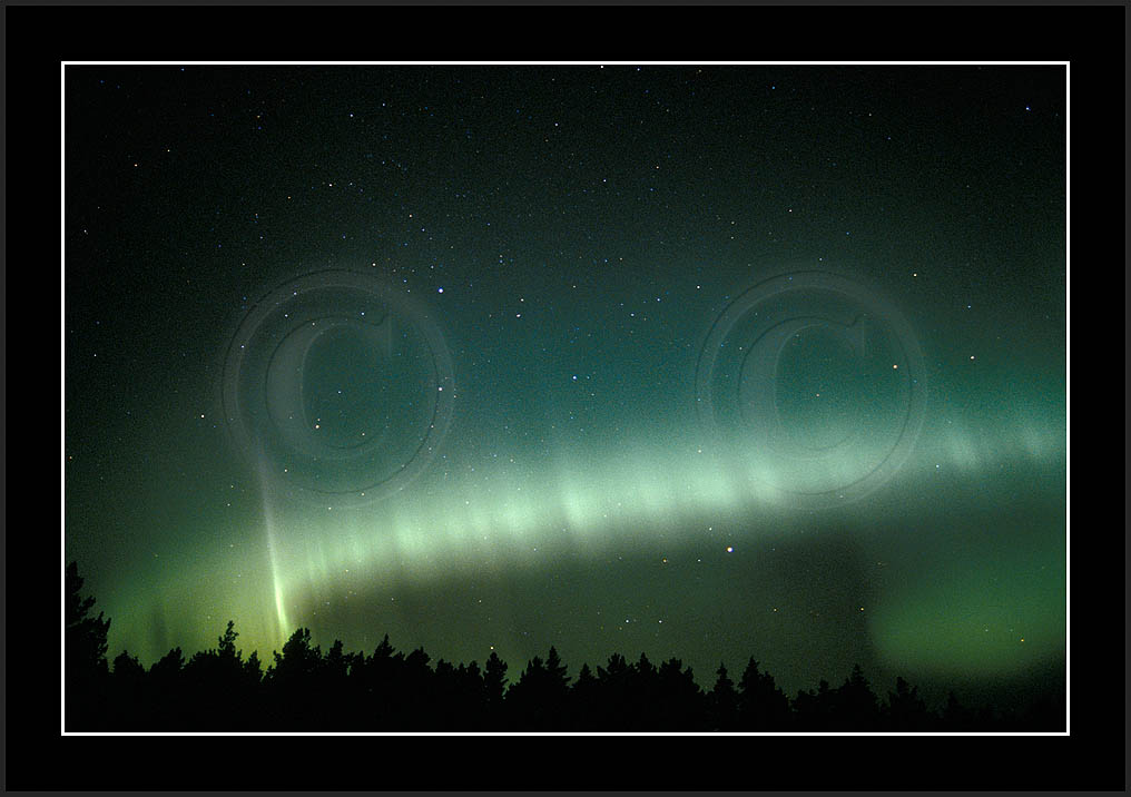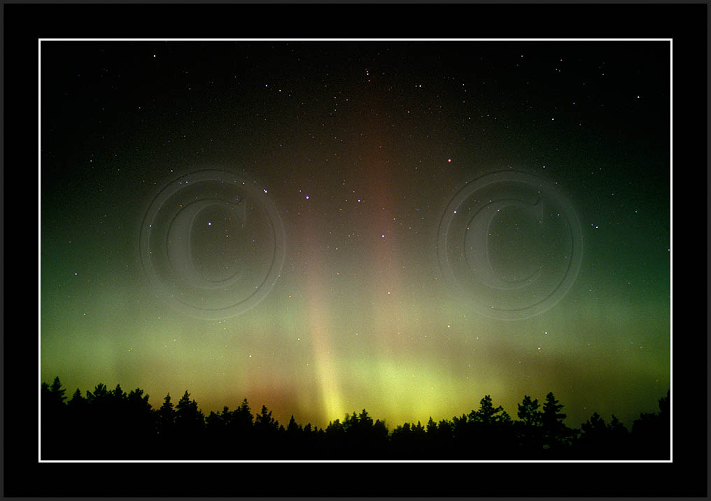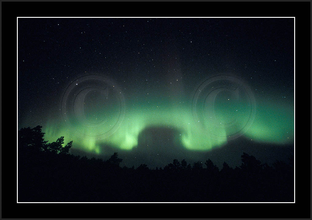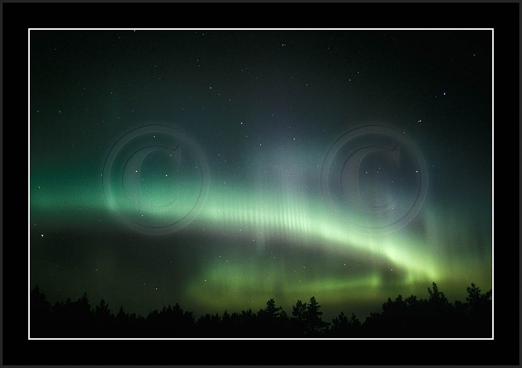 After October's first major storm one cloudy (and also "aurora free") night was followed by another major display on 3/4 (all images here down to re29744). Missing colours (but green) was quite evident during the night; also there was not too much fine structure in the vast aurora forms. Again after a couple of cloudy (and again practically "aurora-free") nights one more night Oct 7/8 (images re29821-30813) was lit by heavenly lights. This night, however, was partly spoiled by clouds. Apparently I lost the very high point of the display although the final bright red column was very conspicious.