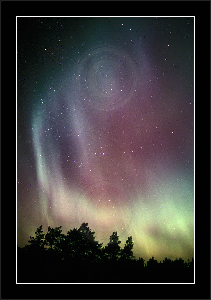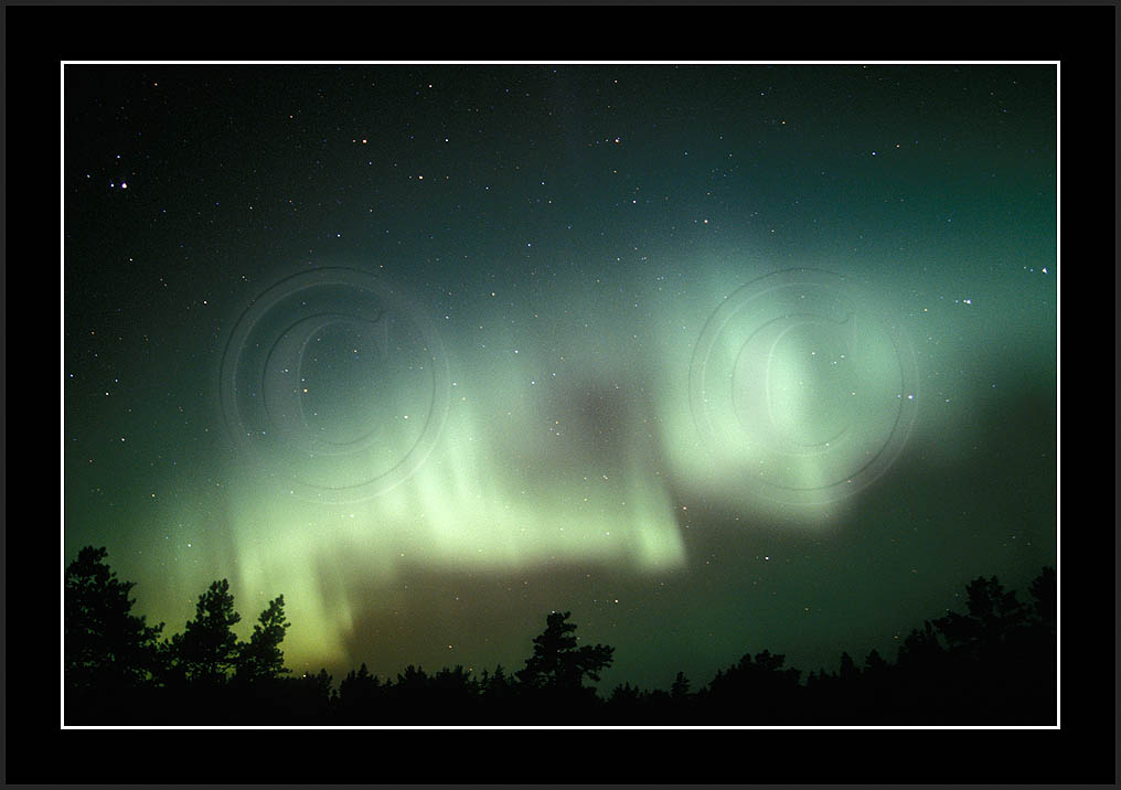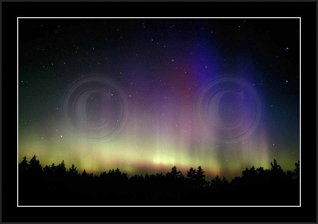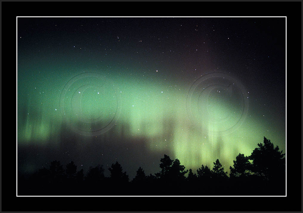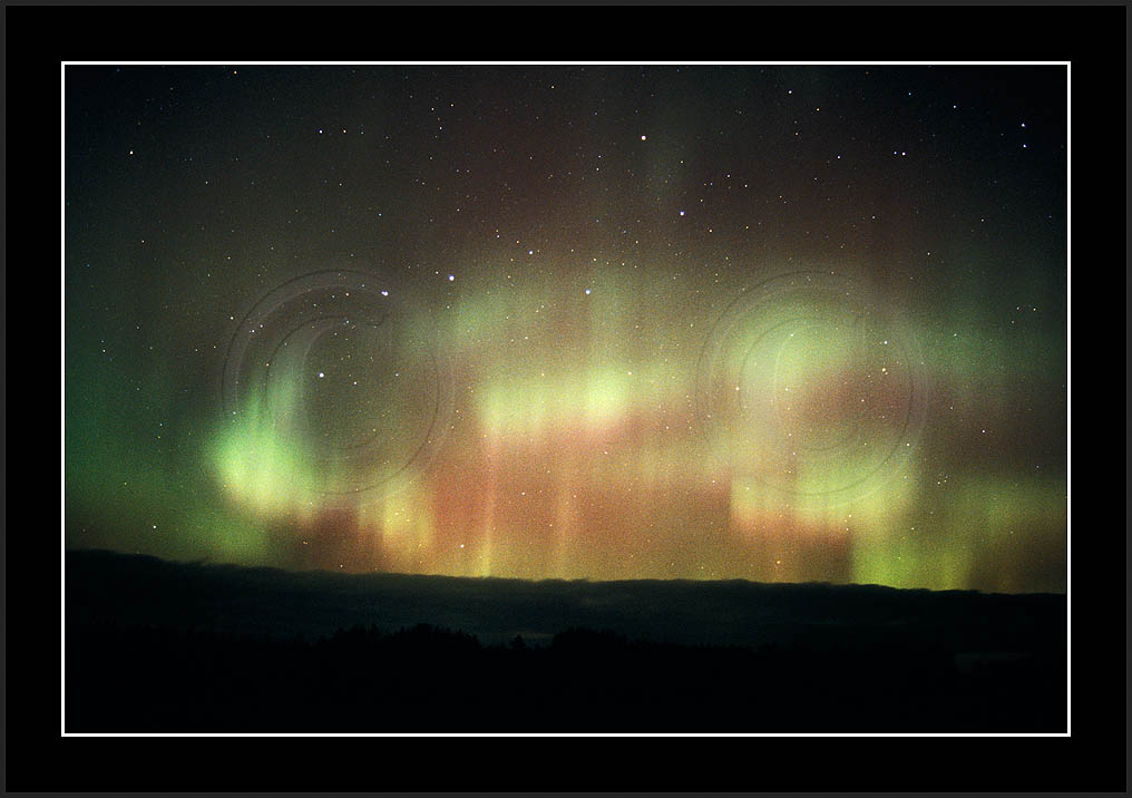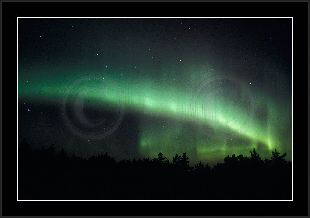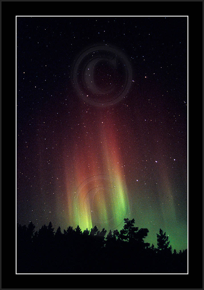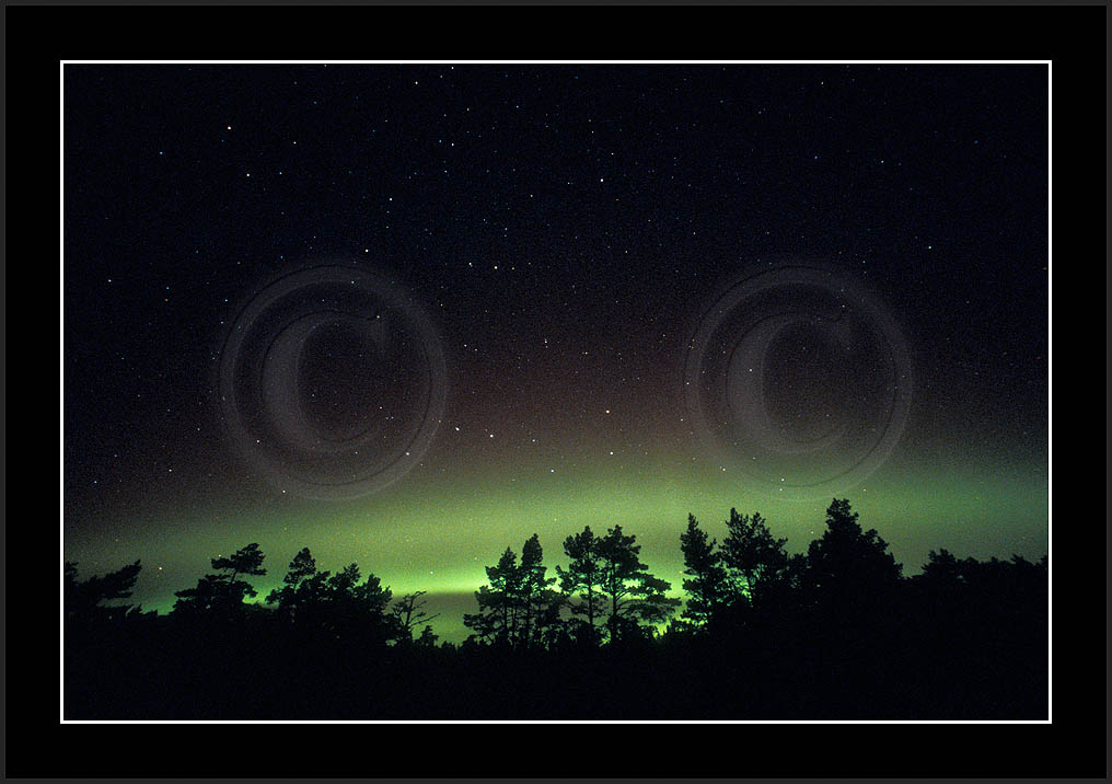 After October's first major storm one cloudy (and also "aurora free") night was followed by another major display on 3/4 (all images here down to re29744). Missing colours (but green) was quite evident during the night; also there was not too much fine structure in the vast aurora forms. Again after a couple of cloudy (and again practically "aurora-free") nights one more night Oct 7/8 (images re29821-30813) was lit by heavenly lights. This night, however, was partly spoiled by clouds. Apparently I lost the very high point of the display although the final bright red column was very conspicious.