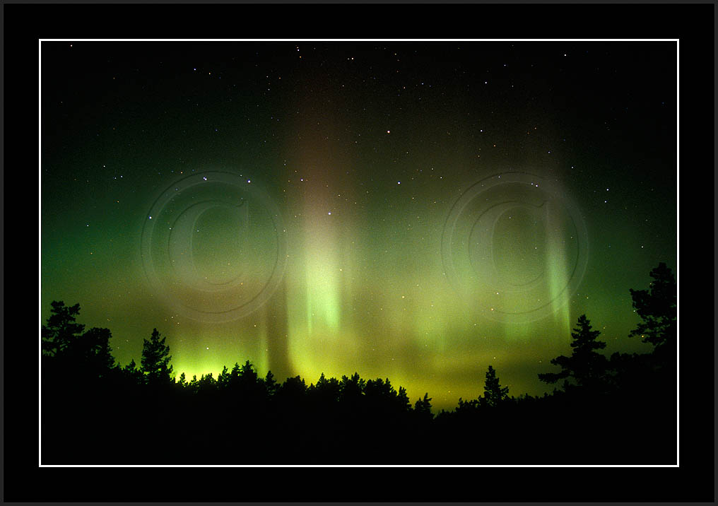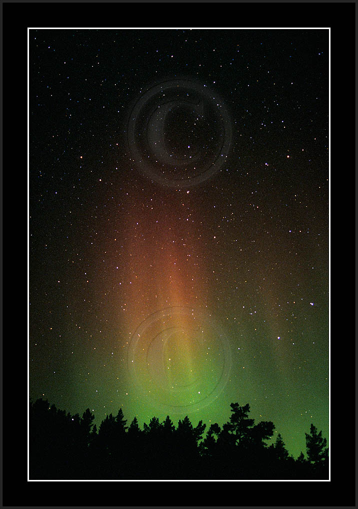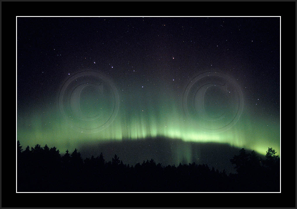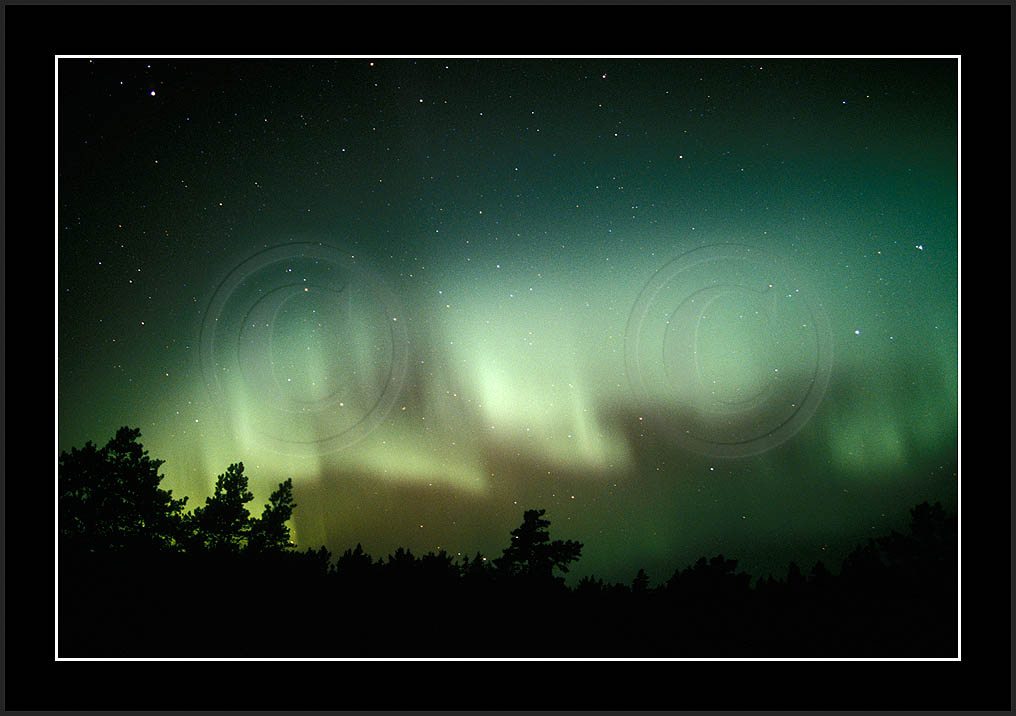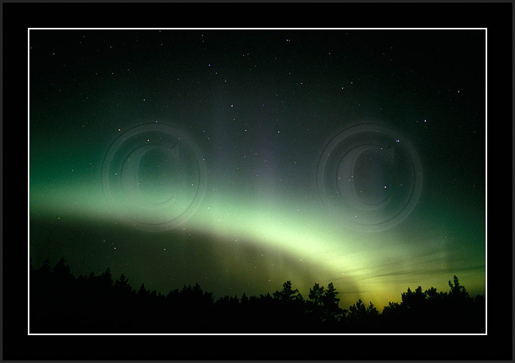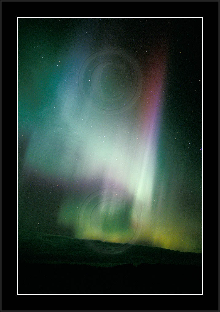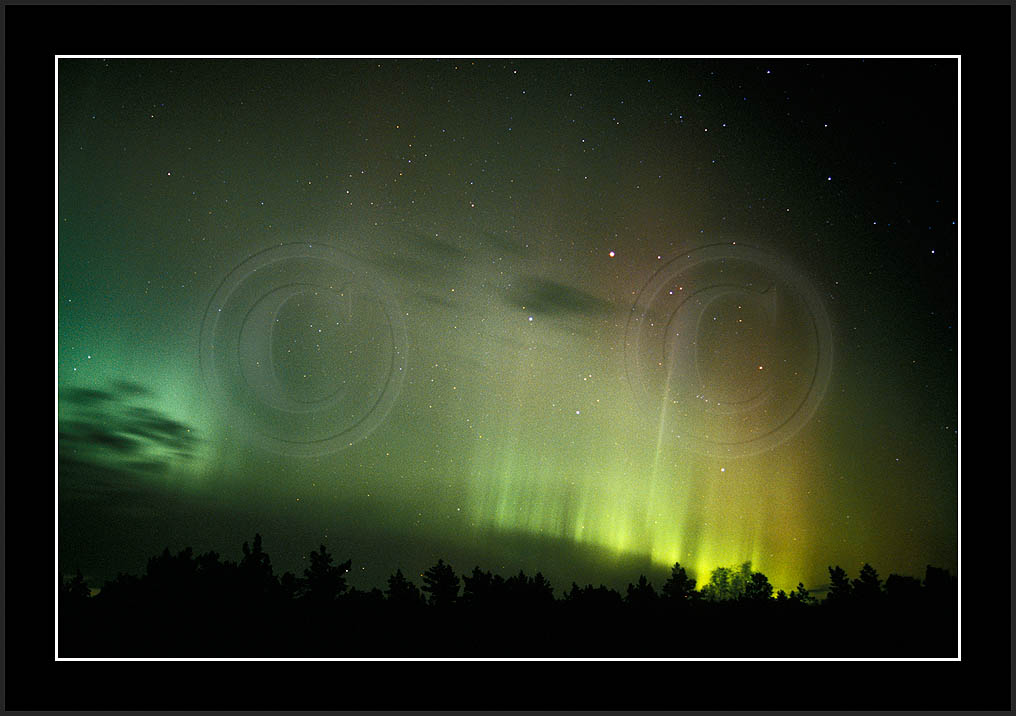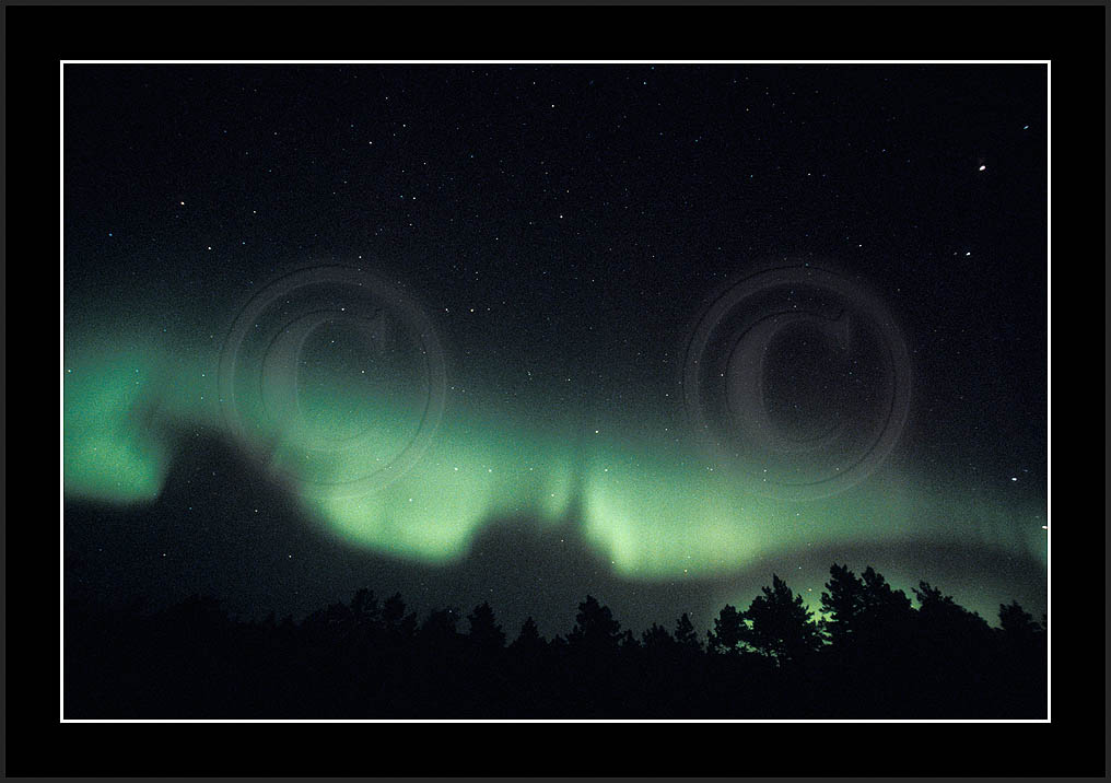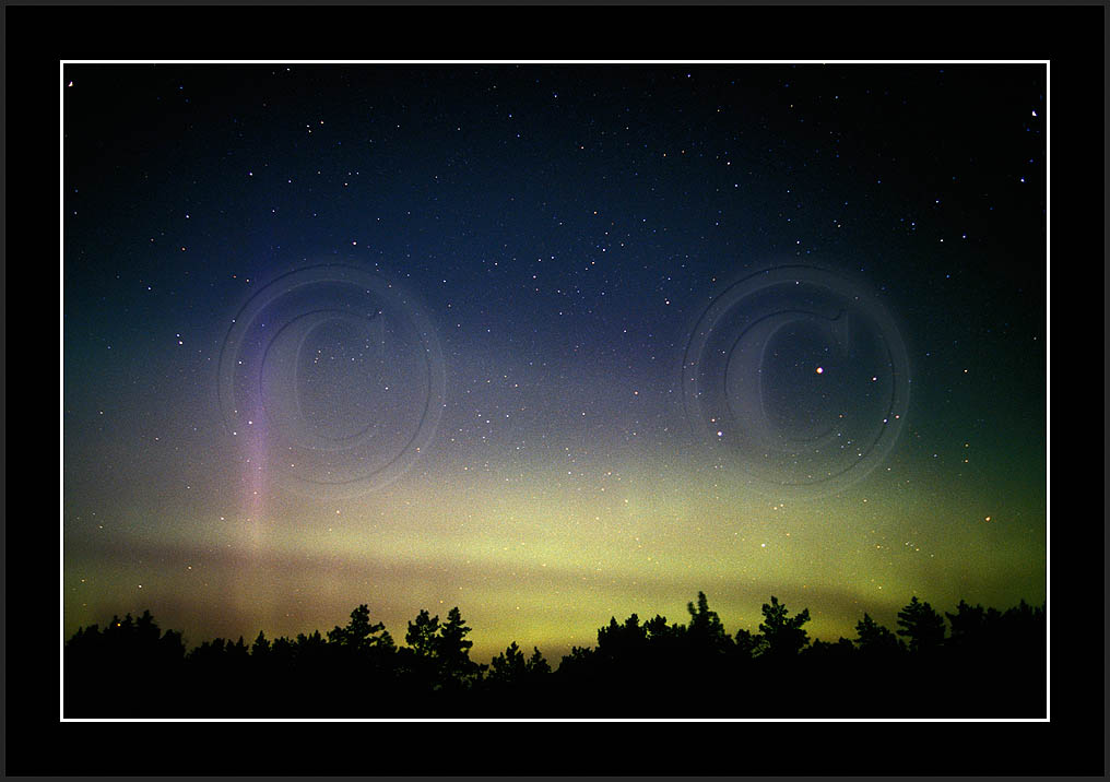 After October's first major storm one cloudy (and also "aurora free") night was followed by another major display on 3/4 (all images here down to re29744). Missing colours (but green) was quite evident during the night; also there was not too much fine structure in the vast aurora forms. Again after a couple of cloudy (and again practically "aurora-free") nights one more night Oct 7/8 (images re29821-30813) was lit by heavenly lights. This night, however, was partly spoiled by clouds. Apparently I lost the very high point of the display although the final bright red column was very conspicious.