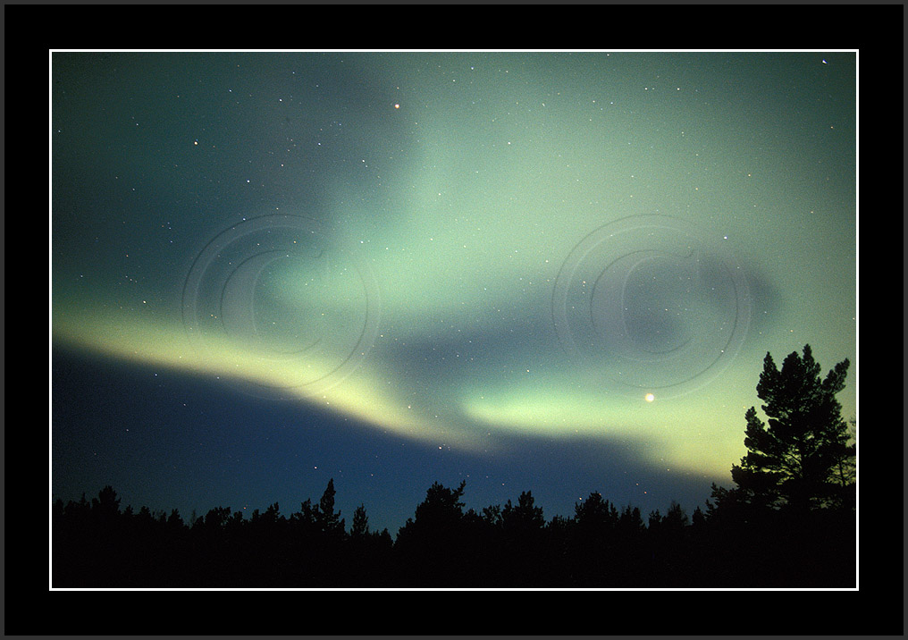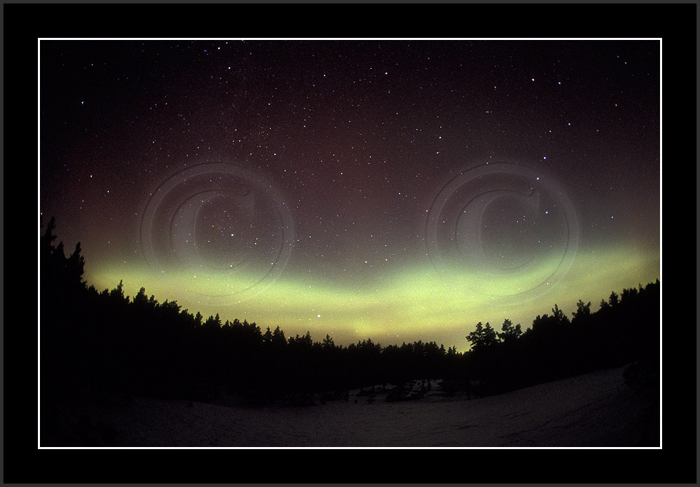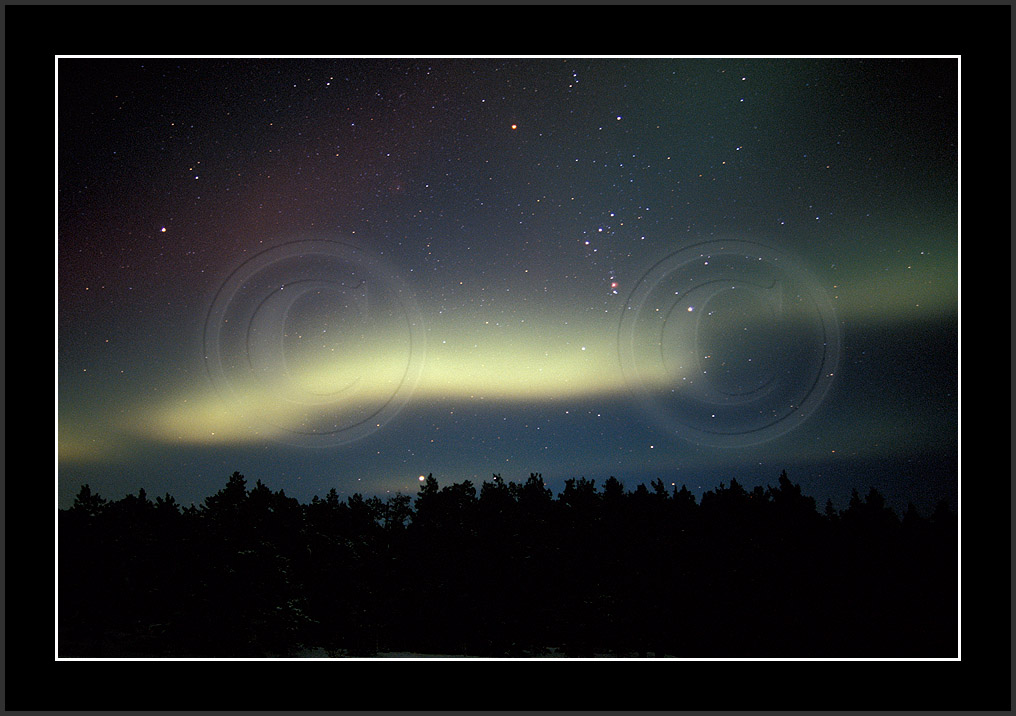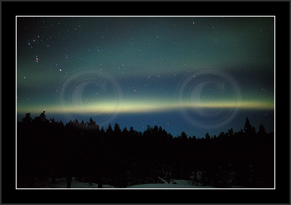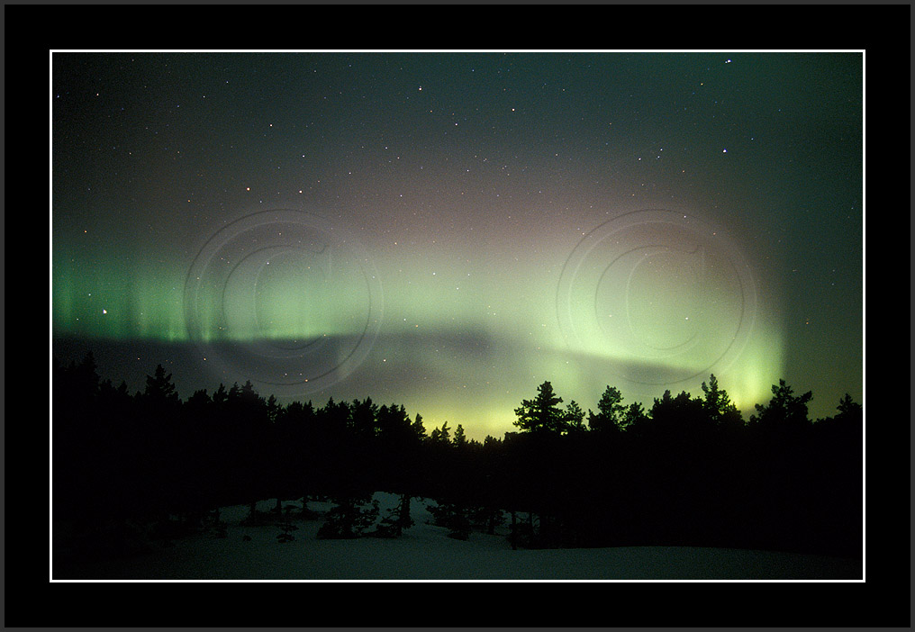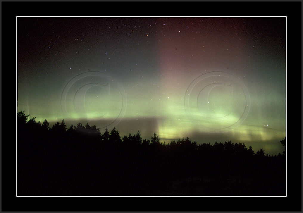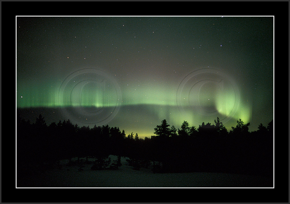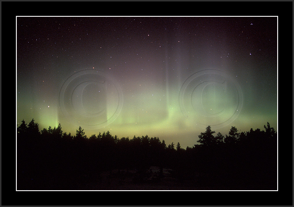 The rest of images are from a "surprise" display 11/12 Feb 2004. There was no CME known to arrive and also the most probable source - solar wind from a coronal hole - did not give too much hope of a good display. However, before leaving for star photography it was evident from Costello-prediction that there was moderate auroral activity on. In the early evening 17-19 UT the whole sky was full of diffuse and "peculiar" shaped aurora. It is not common at my relatively southern latitude to have auroras extending down to 10 degrees in south. The very last image with reddish aurora glow is from Feb 21/22.