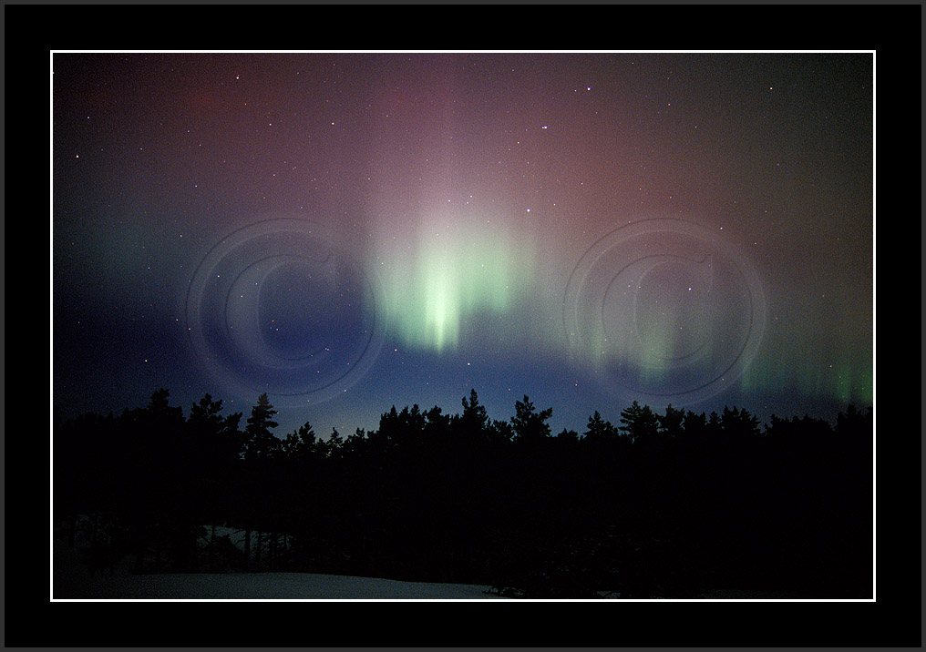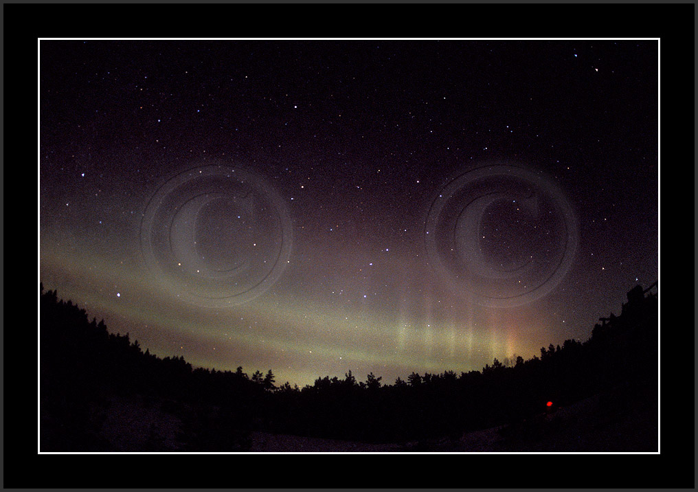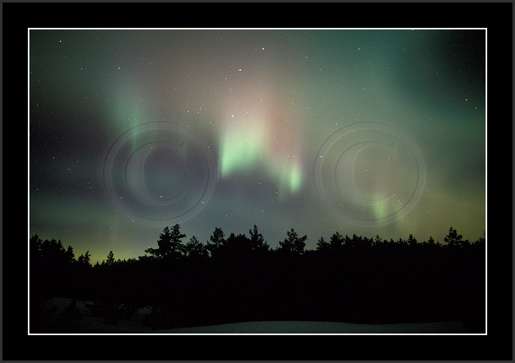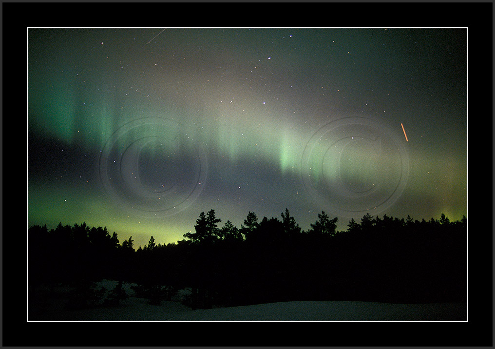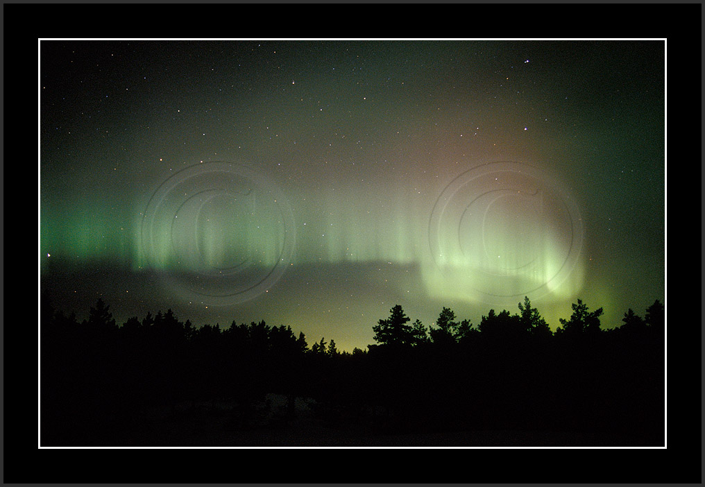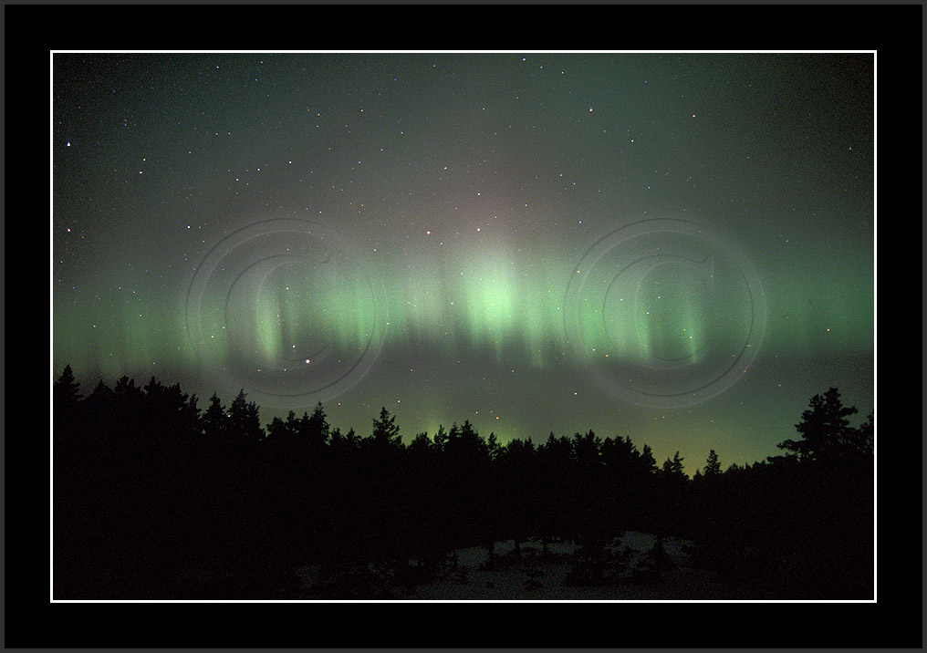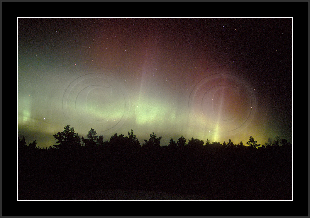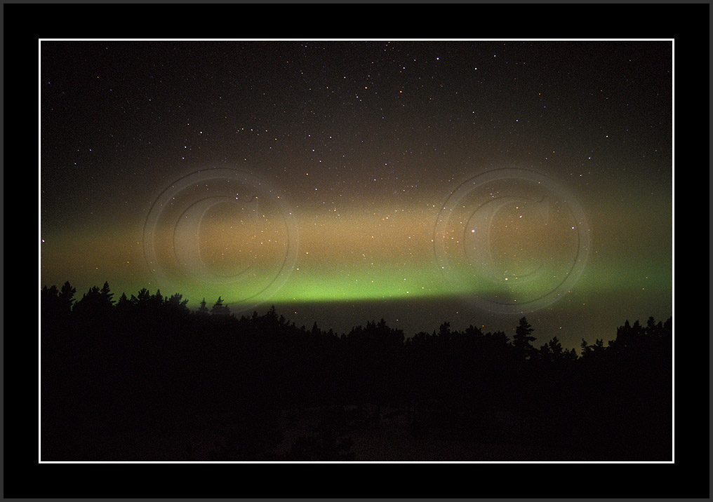 The rest of images are from a "surprise" display 11/12 Feb 2004. There was no CME known to arrive and also the most probable source - solar wind from a coronal hole - did not give too much hope of a good display. However, before leaving for star photography it was evident from Costello-prediction that there was moderate auroral activity on. In the early evening 17-19 UT the whole sky was full of diffuse and "peculiar" shaped aurora. It is not common at my relatively southern latitude to have auroras extending down to 10 degrees in south. The very last image with reddish aurora glow is from Feb 21/22.