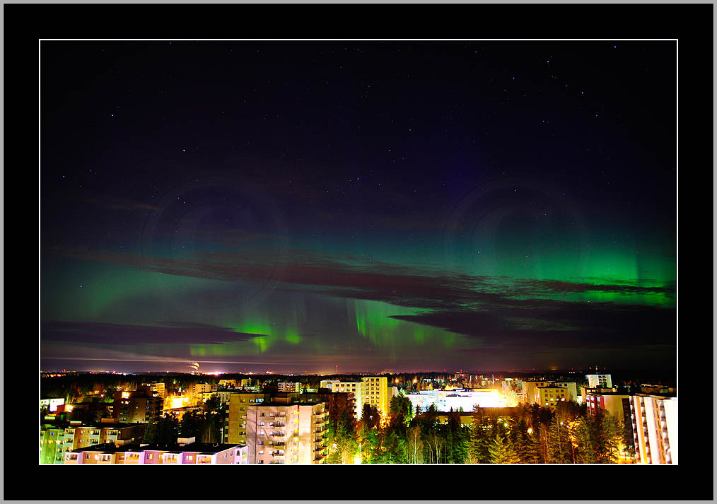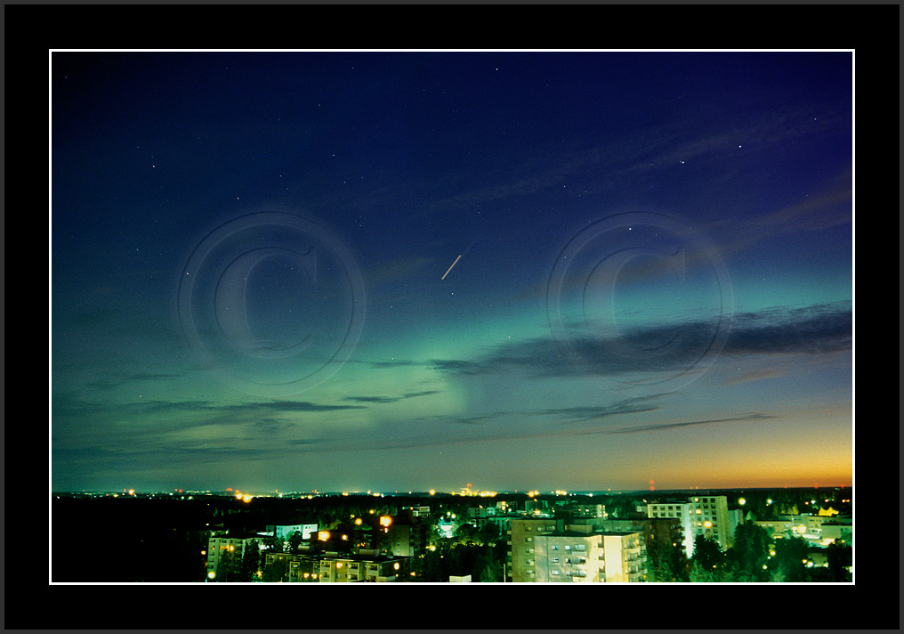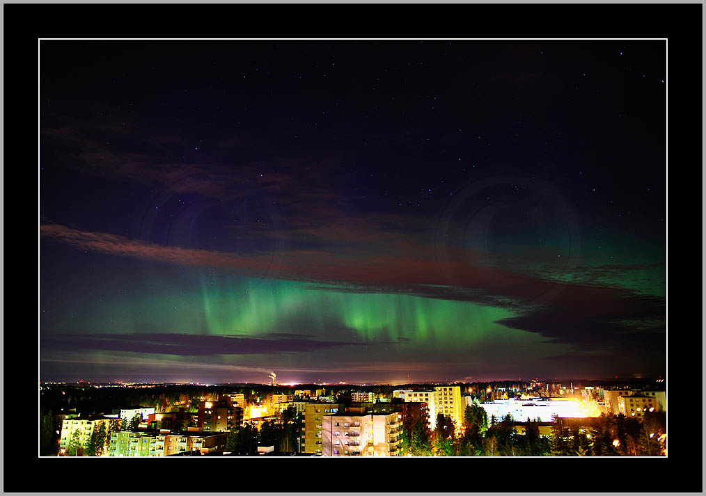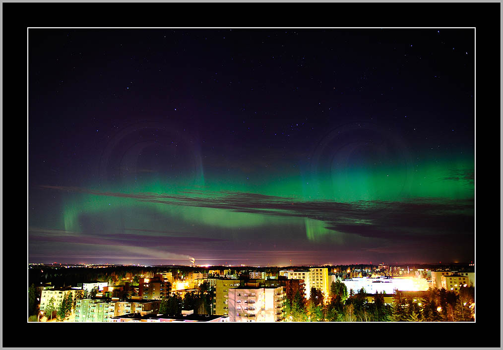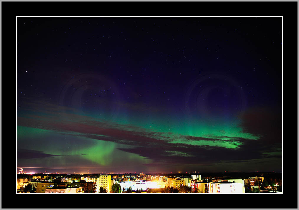 My latitude 60N has not since 2006 experienced any reasonable aurora show - not to speak of a great show. Just five samples from April 2009 were posted in April 2011! The greens in my first digital auroras are still too caramel even though saturation was greatly reduced.