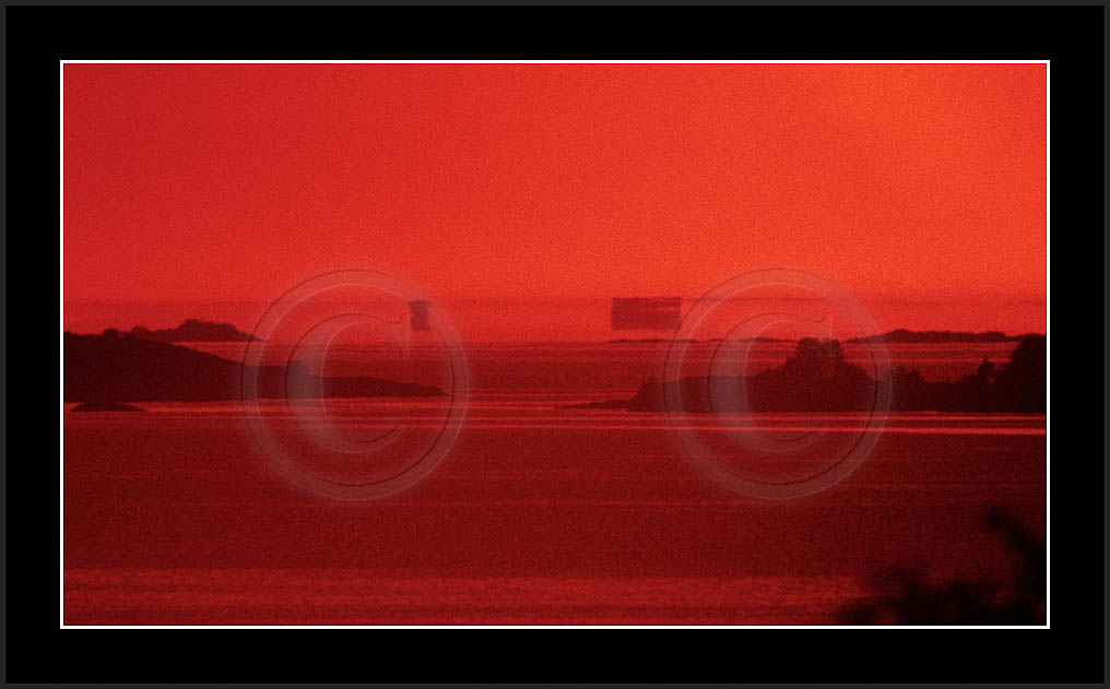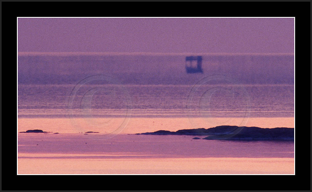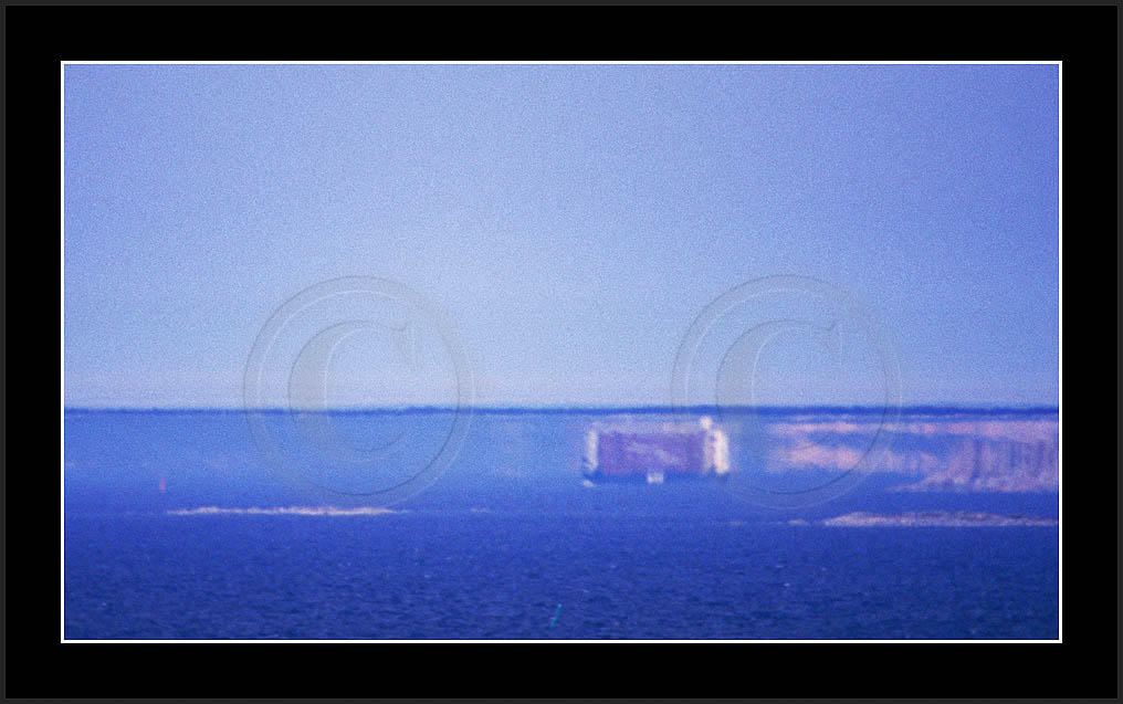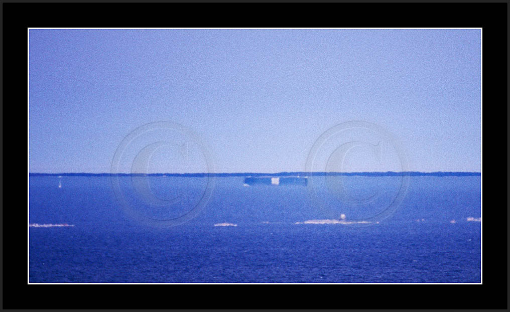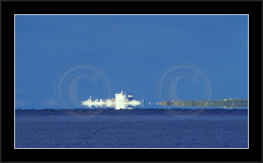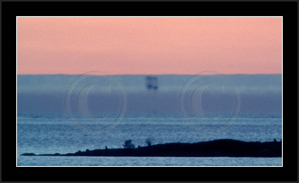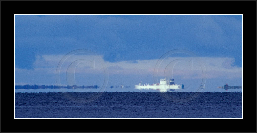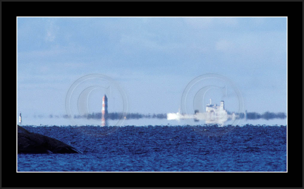 One frequently seen mirage is the 'Flying Dutchman', where a dark silhouette of a distant ship and its superior mirage are slowly moving in horizon. See image 'Laiva4' below