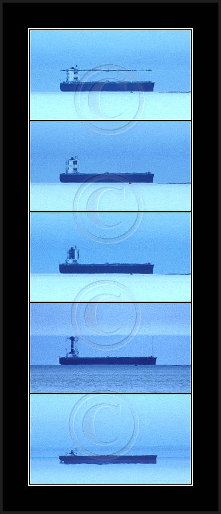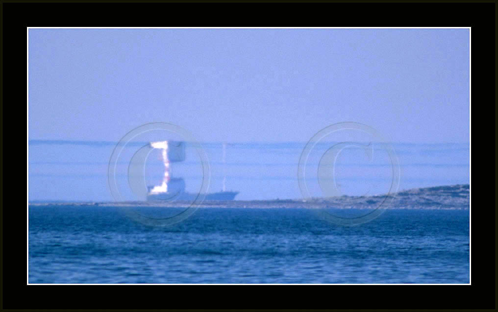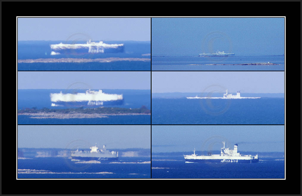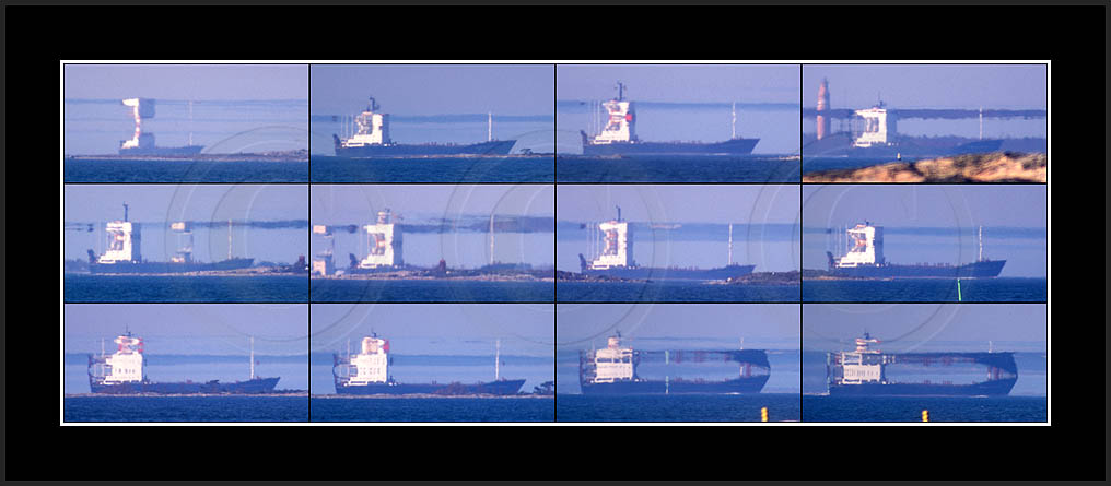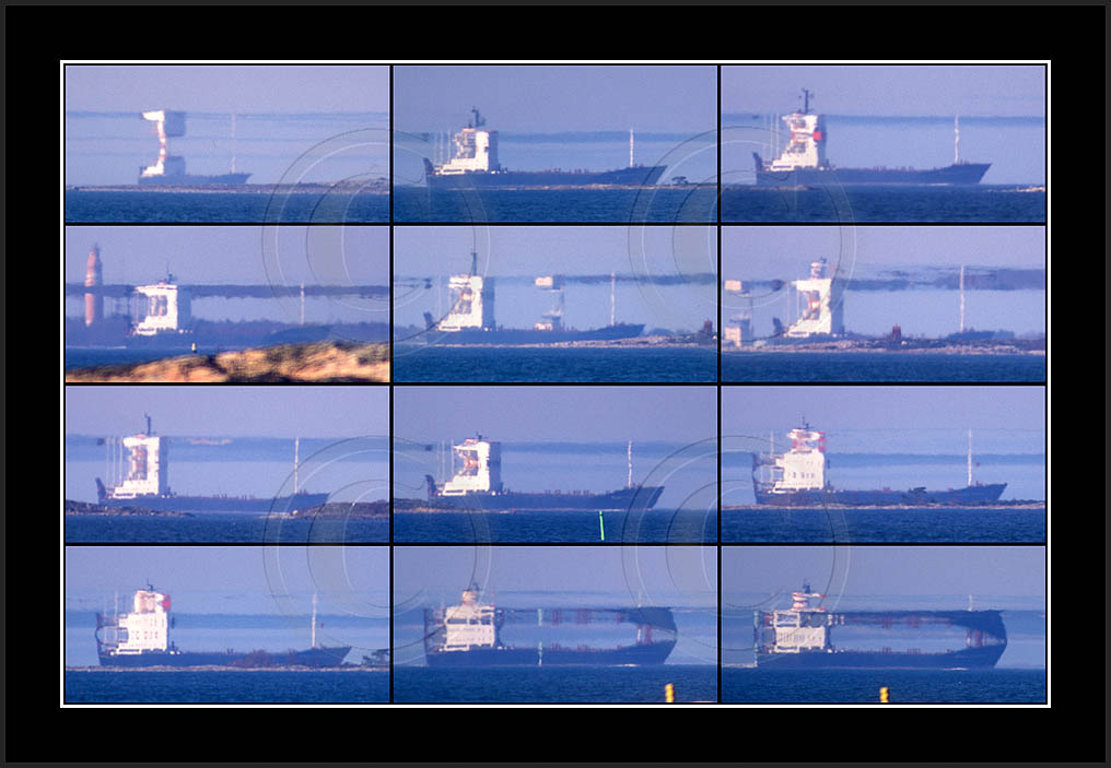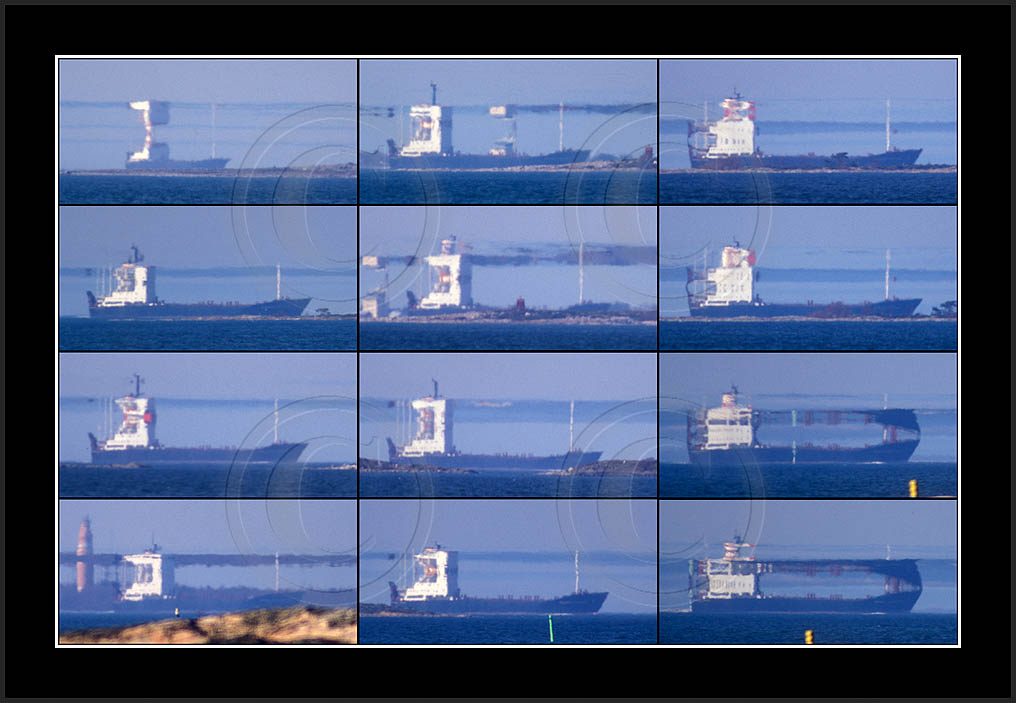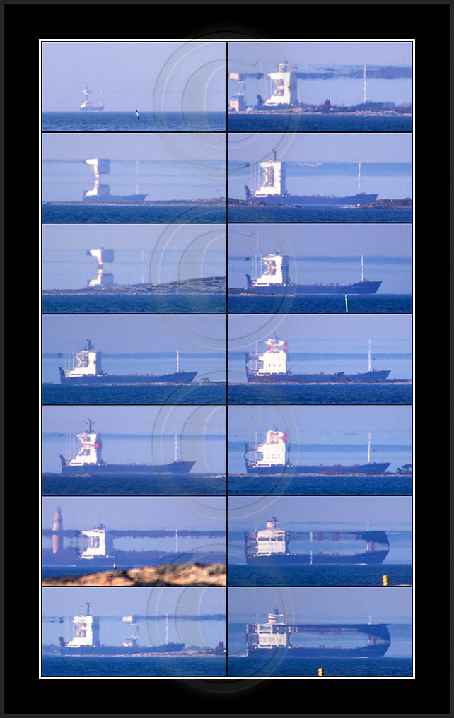 In the middle of the page a most dramatic display is posted. This is by far my best ever sequence of a superior mirage, rich in details and of good contrast. In this case the ship approached from far away and passed at close distance (10km) allowing a good view and a lot of different shapes due to changing distance. This mirage was recorded also with video and is posted in video section.