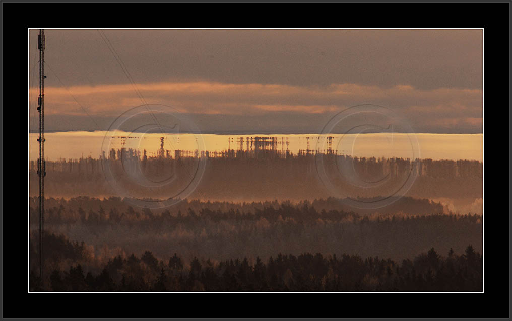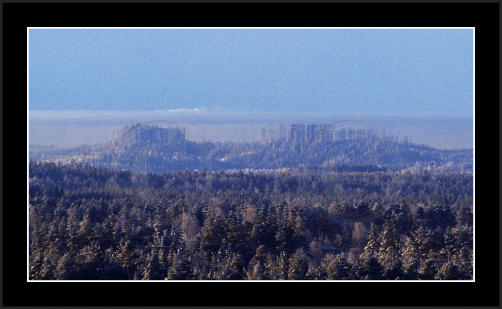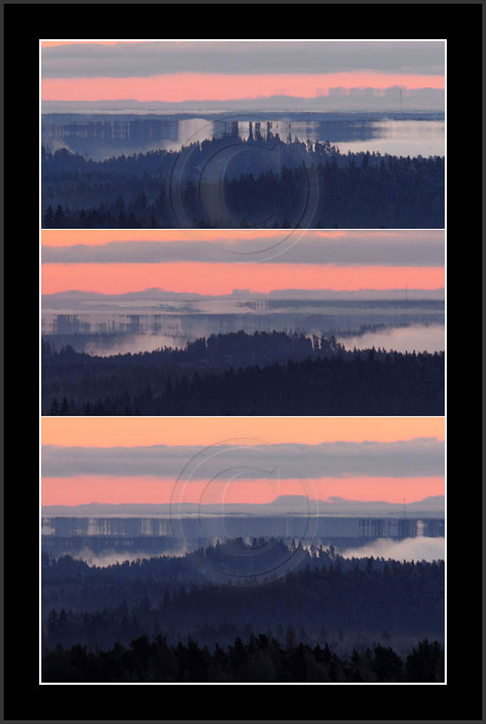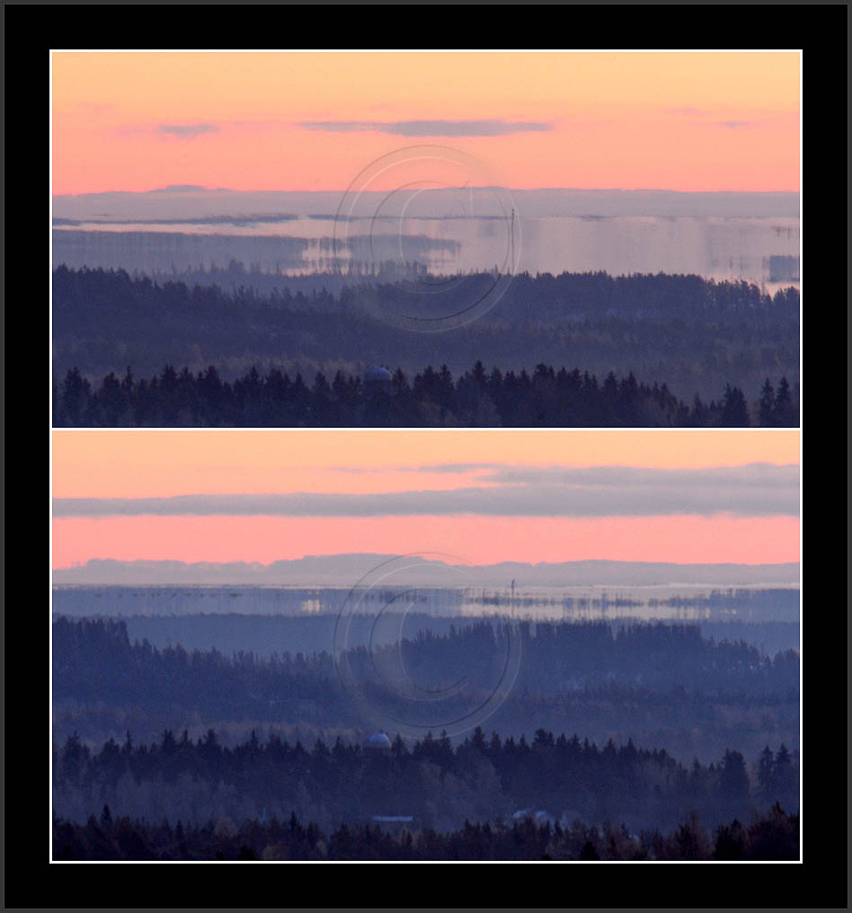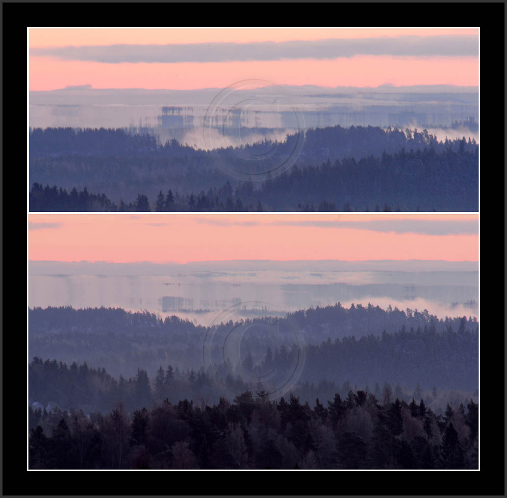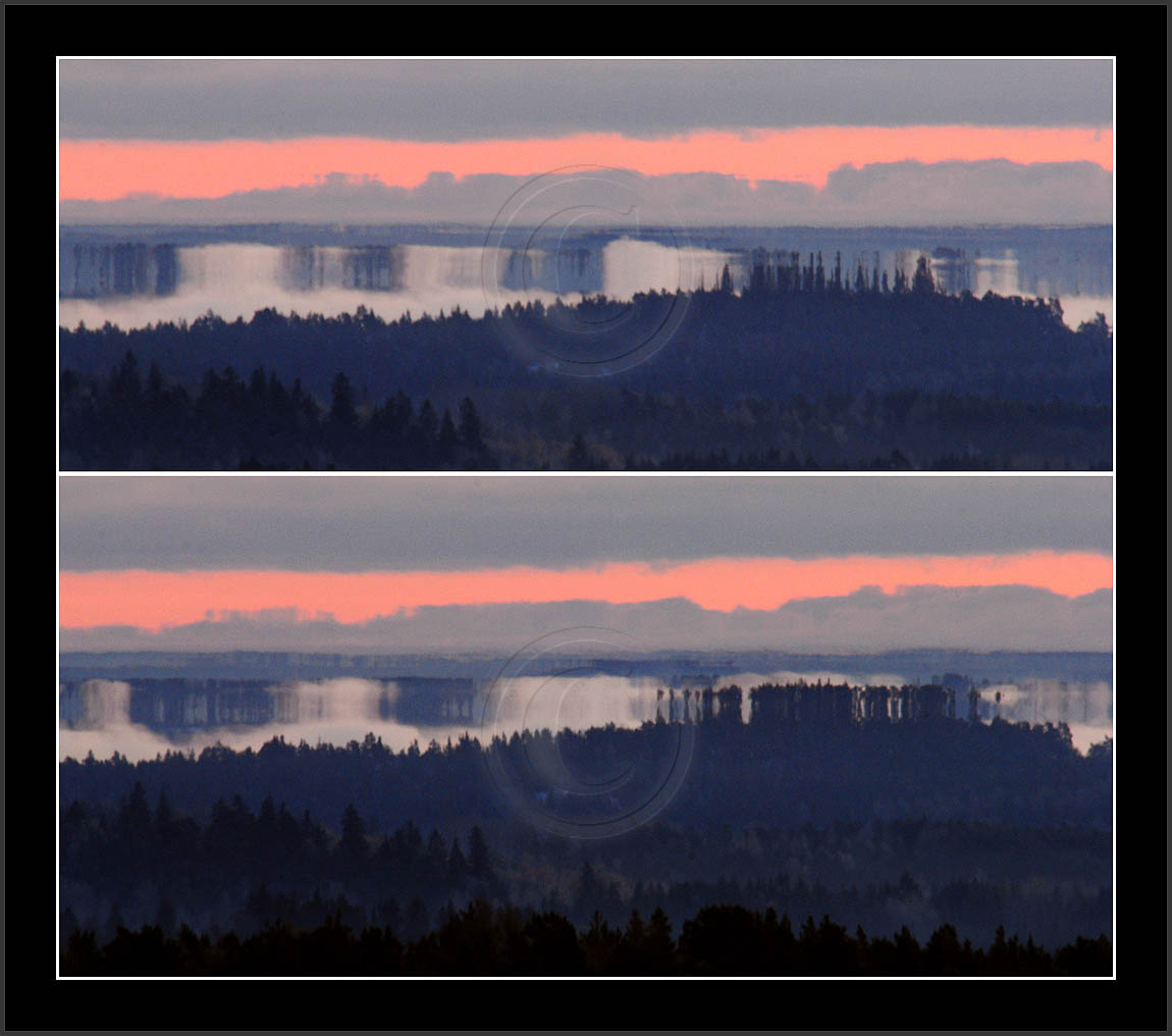 Open sea and large lakes are 'famous' of their (superior) mirages. Perhaps these phenomena are more frequent over water and perhaps stories of ghost ships and of Fata Morgana are familair and too thrilling leaving less interest in land observations. However, cold and calm winter mornings can create nice displays of distant tree lines as shown on this and on the next page. Note also how fog is miraging between tree lines.