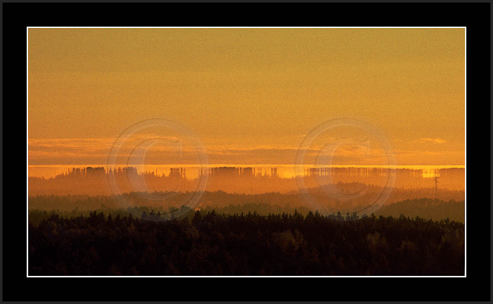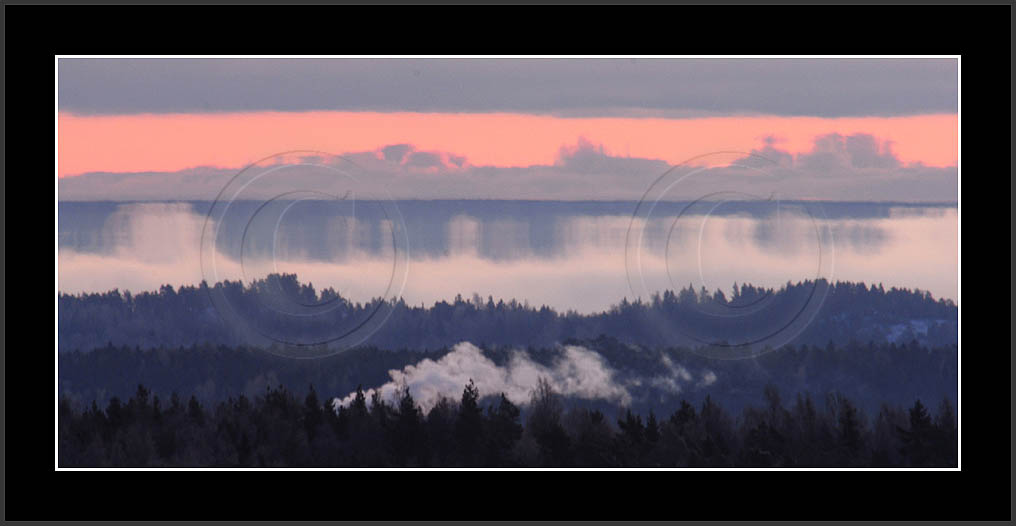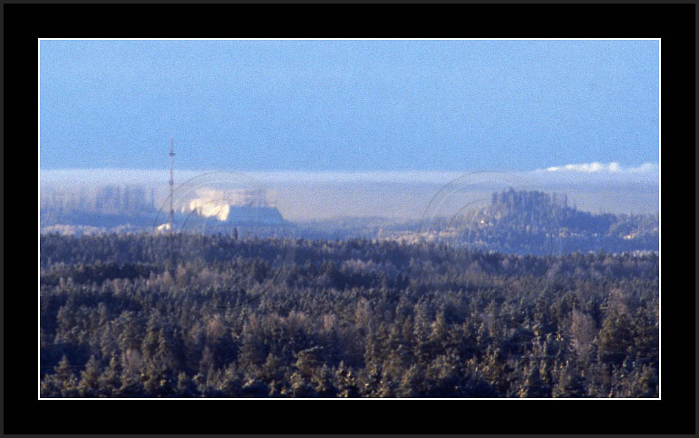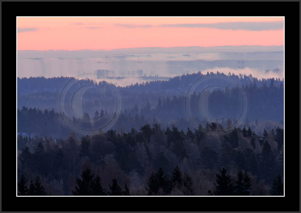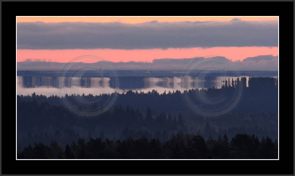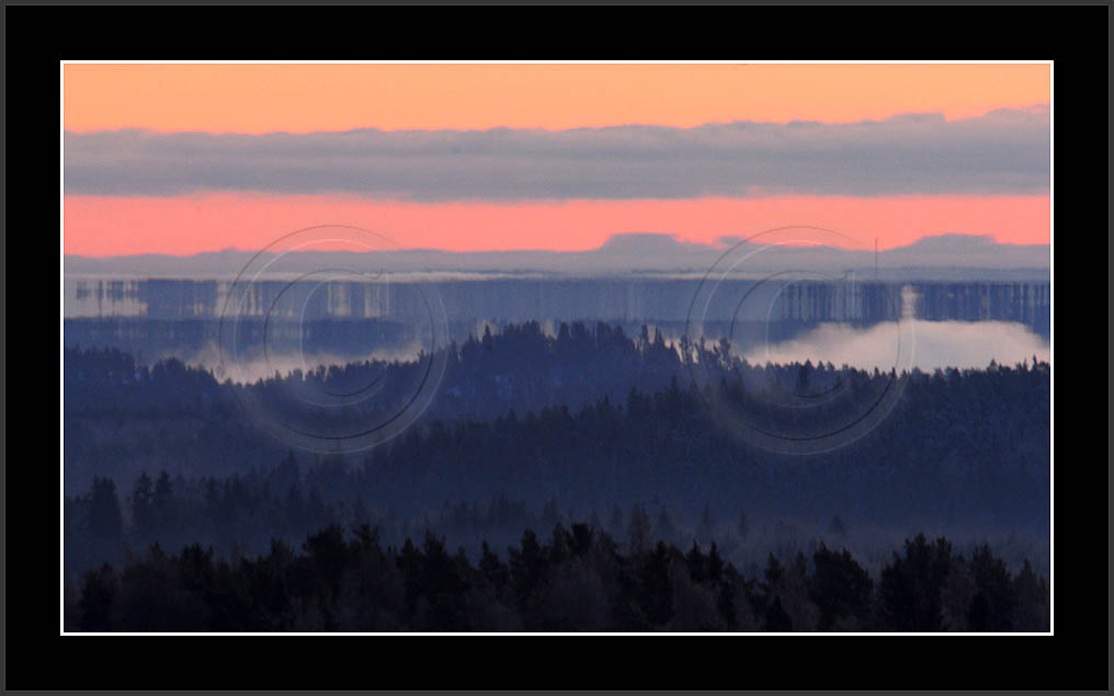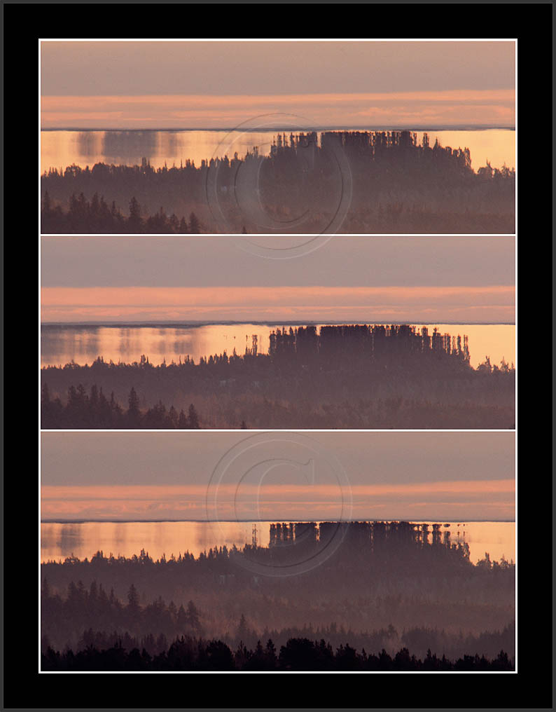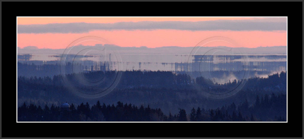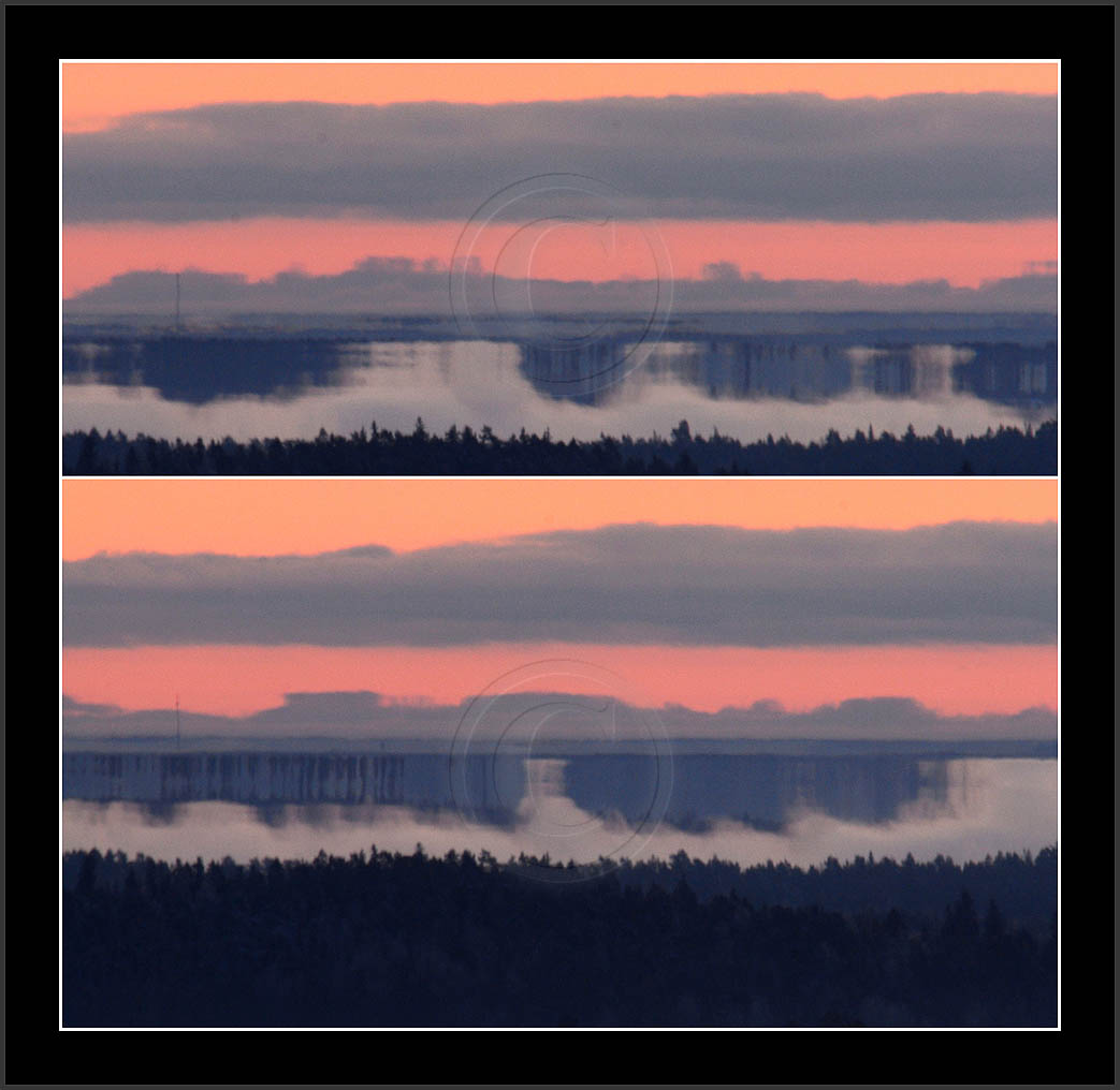 Open sea and large lakes are 'famous' of their (superior) mirages. Perhaps these phenomena are more frequent over water and perhaps stories of ghost ships and of Fata Morgana are familair and too thrilling leaving less interest in land observations. However, cold and calm winter mornings can create nice displays of distant tree lines as shown on this and on the next page. Note also how fog is miraging between tree lines.